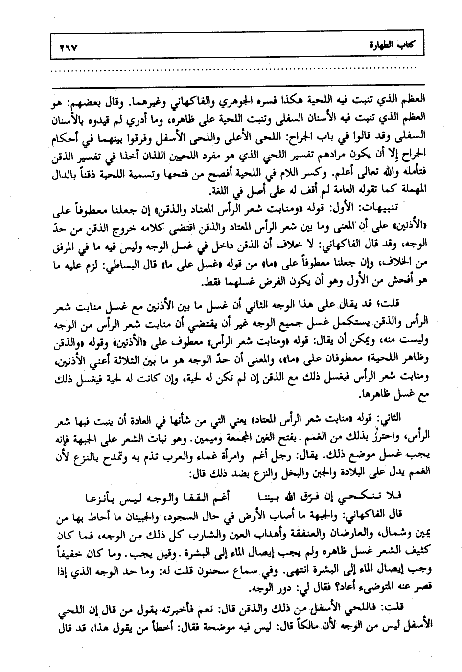 تنبيهات: الأول: قوله: "ومنابت شعر الرأس المعتاد والذقن" إن جعلنا معطوفا على الأذنين على أن المعنى وما بين شعر الرأس المعتاد كلامه خروج الذقن من حد الوجه وقد قال الفاكهاني: لا خلاف أن الذقن داخل في غسل الوجه وليس فيه ما في المرفق من الخلاف وإن جعلنا معطوفا على "ما" من قوله: "غسل على ما" قال البساطي: لزم عليه ما هو أفحش من الأول وهو أن يكون الفرض غسلهما فقط قلت: قد يقال على هذا الوجه الثاني أن غسل ما بين الأذنين مع غسل منابت شعر الرأس والذقن يستكمل غسل جميع الوجه غير أن يقتضي أن منابت شعر الرأس من الوجه وليست منه ويمكن أن يقال قوله: "ومنابت شعر الرأس" معطوف على "الأذنين" وقوله: "والذقن وظاهر اللحية" معطوفان على "ما" والمعنى أن حد الوجه هو ما بين الثلاثة أعني الأذنين ومنابت شعر الرأس فيغسل ذلك مع الذقن إن لم تكن له لحية وإن كانت له لحية فيغسل ذلك مع غسل ظاهرها.