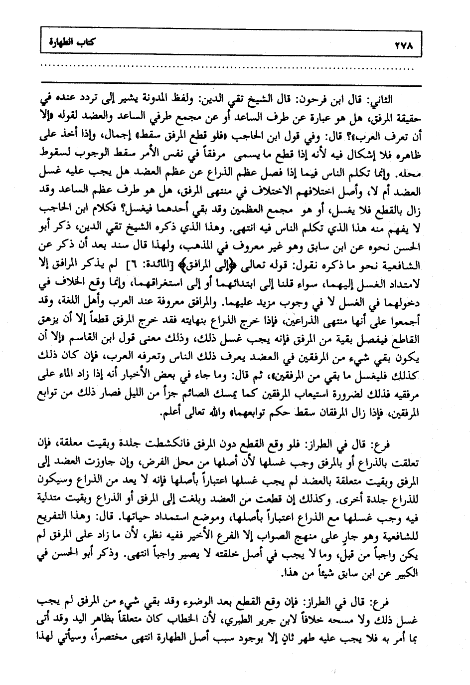 الثاني قال ابن فرحون: قال الشيخ تقي الدين: ولفظ المدونة يشير إلى تردد عنده في حقيقة المرفق هل هو عبارة عن طرف الساعد أو عن مجمع طرفي الساعد والعضد لقوله إلا أن تعرف العرب قال وفي قول ابن الحاجب فلو قطع المرفق سقط إجمال وإذا أخذ على ظاهره فلا إشكال فيه لأنه إذا قطع ما يسمى مرفقا في نفس الأمر سقط الوجوب لسقوط محله وإنما تكلم الناس فيما إذا فصل عظم الذراع عن عظم العضد هل يجب عليه غسل العضد أم لا وأصل اختلافهم الاختلاف في منتهى المرفق هل هو طرف عظم الساعد وقد زال بالقطع فلا يغسل أو هو مجمع العظمين وقد بقي أحدهما فيغسل فكلام ابن الحاجب لا يفهم منه هذا الذي تكلم الناس فيه انتهى. وهذا الذي ذكره الشيخ تقي الدين ذكر أبو الحسن نحوه عن ابن سابق معروف في المذهب ولهذا قال سند بعد أن ذكر عن الشافعية نحو ما ذكره نقول: قوله تعالى: {إِلَى الْمَرَافِقِ} [المائدة: 6] لم يذكر المرافق إلا لامتداد الغسل إليهما سواء قلنا إلى ابتدائهما أو إلى استغراقهما وإنما وقع الخلاف في دخولهما في الغسل لا في وجوب مزيد عليهما والمرافق معروفة عند العرب وأهل اللغة وقد أجمعوا على أنها منتهى الذراعين فإذا خرج الذراع بنهايته فقد خرج المرفق قطعا إلا أن يزهق القاطع فيفصل بقية من المرفق فإنه يجب غسل ذلك وذلك معنى قول ابن القاسم إلا أن يكون بقي شيء من المرفقين في العضد يعرف ذلك الناس وتعرفه العرب فإن كان ذلك كذلك فليغسل ما بقي من المرفقين ثم قال وما جاء في بعض الأخبار أنه إذا زاد الماء على مرفقيه فذلك لضرورة استيعاب المرفقين كما يمسك الصائم جزأ من الليل فصار ذلك من توابع المرفقين فإذا زال المرفقان سقط حكم توابعهما والله تعالى أعلم.