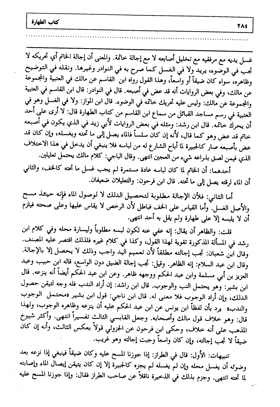 غسل يديه مع مرفقيه مع تخليل أصابعه لا مع إجالة خاتمة والمعنى أن إجالة الخاتم أي تحريكه لا تجب في الوضوء يريد ولا في الغسل كما صرح به في النوادر وغيرها ونقله في التوضيح وظاهره سواء كان ضيقا أو واسعا وهذا القول رواه ابن القاسم عن مالك في العتبية والمجموعة عن مالك وفي بعض الروايات أنه قد عض في أصبعه قال في النوادر قال ابن القاسم في العتبية عن مالك: وليس عليه تحريك خاتمه في الوضوء قالابن المواز ولا في الغسل وهو في العتبية في رسم مساجد القبائل من سماع ابن القاسم من كتاب الطهارة قال لا أرى على أحد أن يحرك خاتمه قال ابن رشد: ومثله في بعض الروايات لأبي زيد في الذي يكون في أصبعه خاتم قد عض وهو كما قال لأنه إن كان سلسا فالماء يصل إلى ما تحته ويغسله وإن كان قد عض بأصبعه صار كالجبيرة لما أباح الشارع له من لباسه فلا ينبغي أن يدخل في هذا الاختلاف الذي فيمن لصق بذراعه شيء من العجين انتهى. وقال الباجي كلام مالك يحتمل تعليلين.