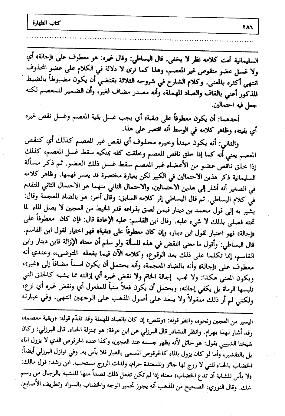 والثاني : أنه يكون مبتدأ وخبره محذوف أي نقص غير المعصم كذلك أي كنقص المعصم يعني أنه كما إذا خلق ناقص المعصم وخلقت كفه بمنكبه سقط غسل المعصم كذلك إذا خلق ناقص عضو من الأعضاء غيرالمعصم سقط غسل ذلك العضو ثم ذكر مسألة السليمانية ذكر هذين الاحتمالين في الكبير لكن بعبارة مختصرة قد يعسر فهمها وظاهر كلامه في الصغير أنه أشار إلى هذين الاحتمالين والاحتمال الثاني منهما هو الاحتمال الثاني المتقدم في كلام البساطي ثم قال البساطي إثر كلامه السابق وقال آخر هو بالضاد المعجمة وقال يشير به إلى قول محمد بن دينار فيمن لصق بذراعه قدر الخيط من العجين لا يصل الماء لما تحته فصلى بذلك لا شيء عليه وقال ابن القاسم عليه الإعادة قال فإن كان معطوفا على إجالة فهو اختيار لقول ابن دينار وإن كان معطوفا على بقية فهو اختيار لقول ابن القاسم قال البساطي وأقول ما في هذه المسألة ولو سلم أن معناه الإزالة فابن دينار وابن القاسم إنما تكلما على ذلك بعد الوقوع وكلامه الآن فيما يفعله المتوضئ وعندي أنه معطوف على إجالة وأنه بالضاد المعجمة وأنه يحتمل أن يكون أعطى مضافا إلى غيره ويكون المعنى هكذا ولا تجب إجالة الخاتم ولا نقض غيره أي إزالته مما يشبه كالحلق التي تلبسها الرماة بل يكفي إجالته ويحتمل أن يكون فعلا مبنيا للمفعول أي ونقض غيره أي نزع ولكني لم أر ذلك منقولا ولا يبعد على أصول المذهب على الوجهين انتهى. وفي عبارته