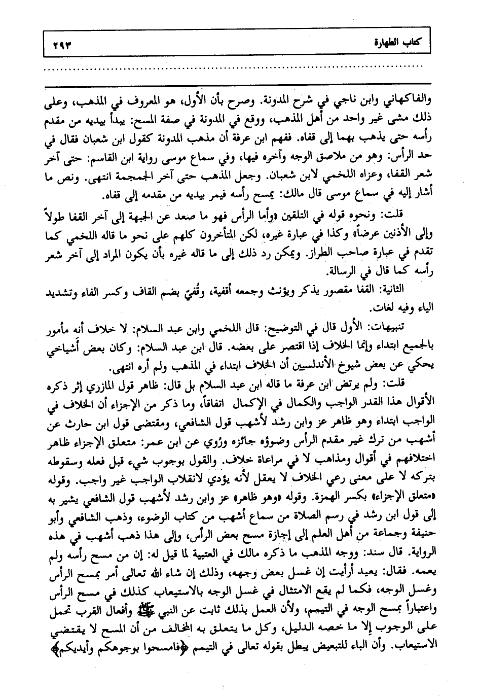 والفاكهاني وابن ناجي في شرح المدونة وصرح بأن الأول هو المعروف في المذهب وعلى ذلك مشى غيرواحد من أهل المذهب ووقع في المدونة في صفة المسح يبدأ بيديه من مقدم رأسه حتى يذهب بهما إلى قفاه ففهم ابن عرفة أن مذهب المدونة كقول ابن شعبان فقال في حد الرأس وهو من ملاصق الوجه وآخره فيها وفي سماع موسى رواية ابن القاسم حتى آخر شعر القفا وعزاه اللخمي لابن شعبان وجعل المذهب حتى آخر الجمجمة انتهى. ونص ما أشار إليه في سماع موسى قال مالك: يمسح رأسه فيمر بيديه من مقدمه إلى قفاه.