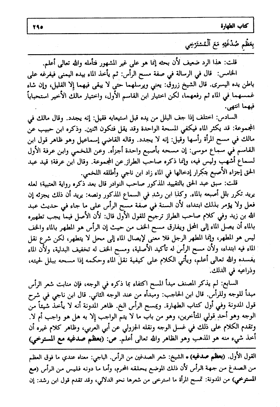 الخامس : قال في الرسالة في صفة مسح الرأس: ثم يأخذ الماء بيده اليمنى فيفرغه على باطن يده اليسرى قال الشيخ زروق: يعني ويرسلهما حتى لا يبقى فيهما إلا القليل وإن شاء غمسهما في الماء ثم رفعهما لكن اختيار ابن القاسم الأول واختيار مالك الأخير استحبابا فيهما انتهى.