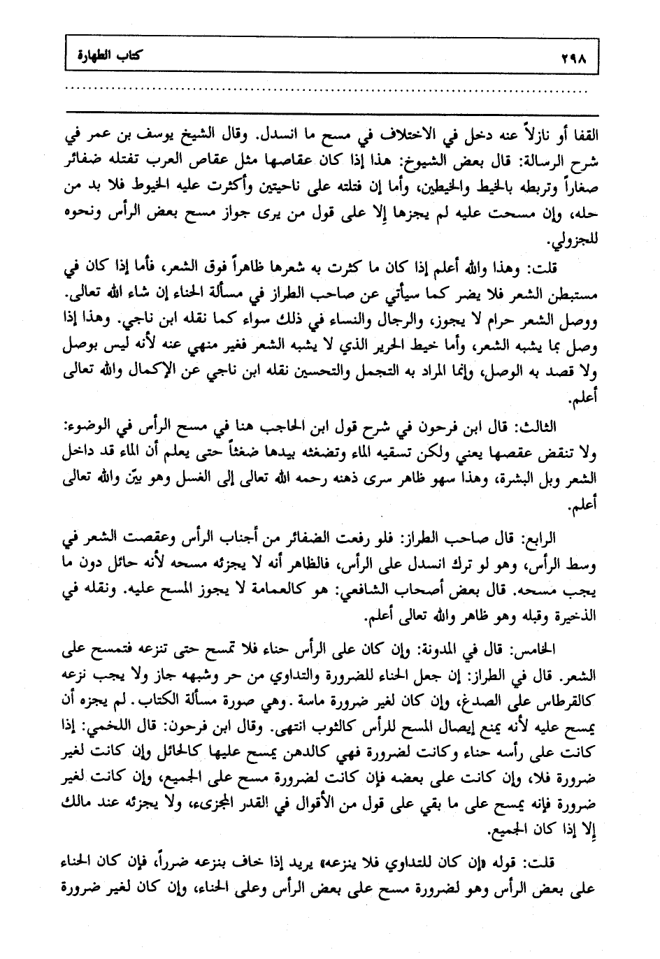 الخامس: قال في المدونة: وإن كان على الرأس حناء فلا تمسح حتى تنزعه فتمسح على الشعر قال في الطراز: إن جعل الحناء للضرورة والتداوي من حر وشبهه جاز ولا يجب نزعه كالقرطاس على الصدغ وإن كان لغير ضرورة ماسة وهي صورة مسألة الكتاب لم يجزه أن يمسح عليه لأنه يمنع إيصال المسح للرأس كالثوب انتهى. وقال ابن فرحون: قال اللخمي: إذا كانت على رأسه حناء وكانت لضرورة فهي كالدهن يمسح عليها كالحائل وإن كانت لغير ضرورة فلا وإن كانت على بعضه فإن كانت لضرورة مسح على الجميع وإن كانت لغير ضرورة فإنه يمسح على ما بقي على قول من الأقوال في القدر المجزئ ولا يجزئه عند مالك إلا إذا كان الجميع.