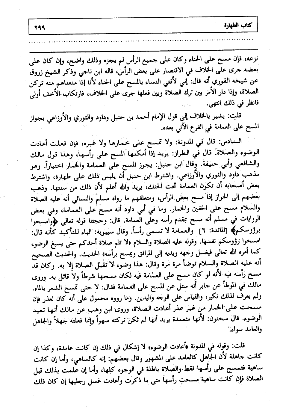 قلت: يشير بالخلاف إلى قول الإمام أحمد بن حنبل وداود والثوري والأوزاعي بجواز المسح على العمامة في الفرع الآتي بعده.