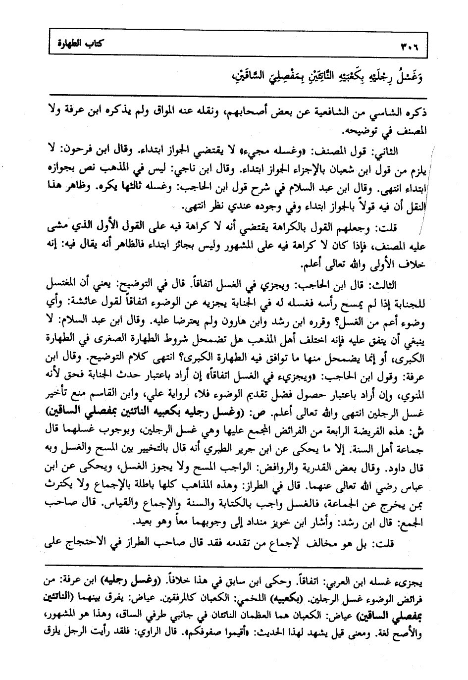 الثالث : قال ابن الحاجب: ويجزي في الغسل اتفاقا قال في التوضيح: يعني أن المغتسل للجنابة إذا لم يمسح رأسه فغسله له في الجنابة يجزيه عن الوضوء اتفاقا لقول عائشة وأي وضوء أعم من الغسل وقرره ابن رشد وابن هارون ولم يعترضا عليه وقال بن عبد السلام لا ينبغي أن يتفق عليه فإنه اختلف أهل المذهب هل تضمحل شروط الطهارة الصغرى في الطهارة الكبرى أو إنما يضمحل منها ما توافق فيه الطهارة الكبرى انتهى. كلام التوضيح وقال ابن عرفة: وقول ابن الحاجب ويجزئ في الغسل اتفاقا إن أراد باعتبار حدث الجنابة فحق لأنه المنوي وإن أراد باعتبار حصول فضل تقديم الوضوء فلا لرواية علي وابن القاسم منع تأخير غسل الرجلين انتهى. والله تعالى أعلم. ص: "وغسل رجليه بكعبيه الناتئين بمفصلي الساقين" ش: هذه الفريضة الرابعة من الفرائض المجمع عليها وهي غسل الرجلين وبوجوب غسلهما قال جماعة أهل السنة إلا ما يحكى عن ابن جرير الطبري أنه قال بالتخيير بين المسح والغسل وبه قال داود وقال بعض القدرية والروافض الواجب المسح ولا يجوز الغسل ويحكى عن ابن عباس رضي الله تعالى عنهما قال في الطراز: وهذه إذنه كلها باطلة بالإجماع ولا يكترث بمن يخرج عن الجماعة فالغسل واجب بالكتابة والسنة والإجماع والقياس قال صاحب الجمع: قال ابن رشد: وأشار ابن خويز منداد إلى وجوبهما معا وهو بعيد.