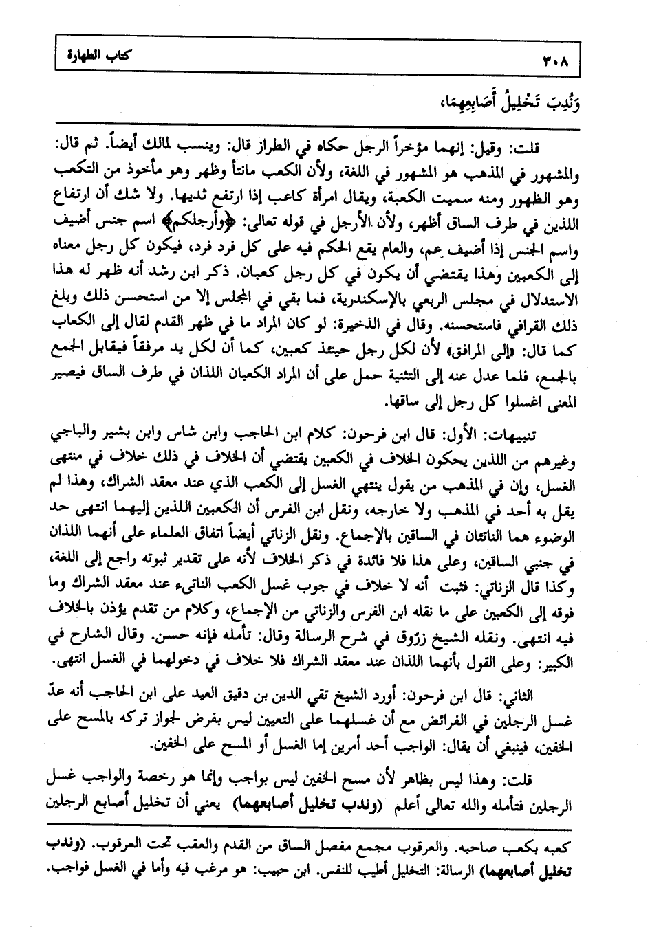 تنبيهات: الأول: قال ابن فرحون: كلام ابن الحاجب وابن شاس وابن بشير والباجي وغيرهم من اللذين يحكون الخلاف في الكعبين يقتضي أن الخلاف في ذلك خلاف في منتهى الغسل وإن في المذهب من يقول ينتهي الغسل إلى الكعب الذي عند معقد الشراك وهذا لم يقل به أحد في المذهب ولا خارجه ونقل ابن الفرس أن الكعبين اللذين إليهما انتهى. حد الوضوء هما الناتئان في الساقين بالإجماع ونقل الزناتي أيضا اتفاق العلماء على أنهما اللذان في جنبي الساقين وعلى هذا فلا فائدة: في ذكر الخلاف لأنه على تقدير ثبوته راجع إلى اللغة وكذا قال الزناتي فثبت أنه لا خلاف في جوب غسل الكعب الناتئ عند معقد الشراك وما فوقه إلى الكعبين على ما نقله ابن الفرس والزناتي من الإجماع وكلام من تقدم يؤذن بالخلاف فيه انتهى. ونقله الشيخ زروق في شرح الرسالة وقال تأمله فإنه حسن وقال الشارح في الكبير وعلى القول بأنهما اللذان عند معقد الشراك فلا خلاف في دخولهما في الغسل انتهى.