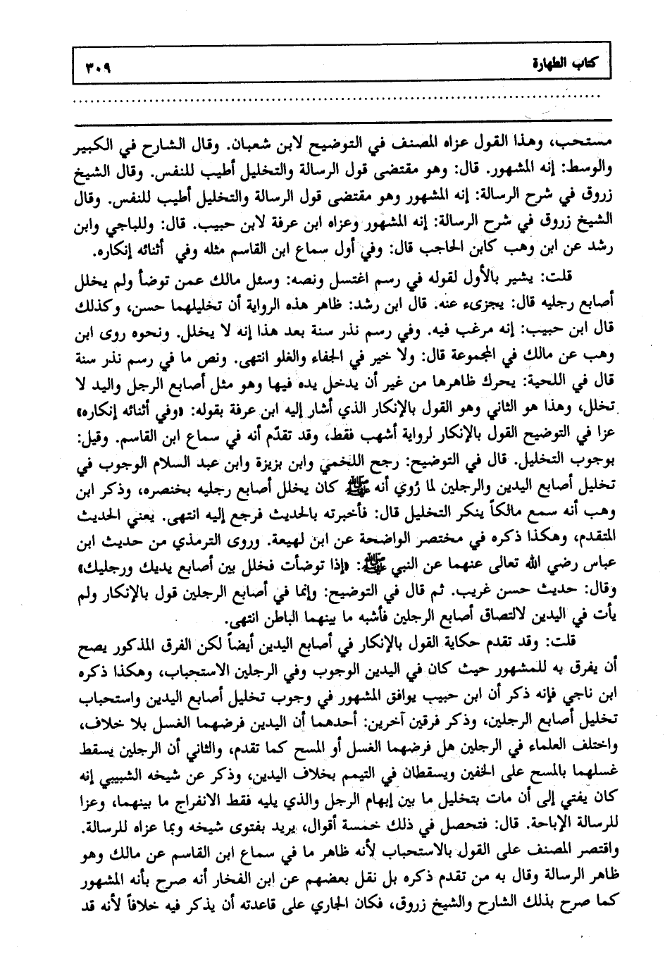 قلت: وقد تقدم حكاية القول بالإنكار في أصابع اليدين أيضا لكن الفرق المذكور يصح أن يفرق به للمشهور حيث كان في اليدين الوجوب وفي الرجلين الاستحباب وهكذا ذكره ابن ناجي فإنه ذكر أن ابن حبيب يوافق المشهور في وجوب تخليل أصابع اليدين واستحباب تخليل أصابع الرجلين وذكر فرقين آخرين أحدهما أن اليدين فرضهما الغسل بلا خلاف واختلف العلماء في الرجلين هل فرضهما الغسل أو المسح كما تقدم والثاني أن الرجلين يسقط غسلهما بالمسح على الخفين ويسقطان في التيمم بخلاف اليدين وذكر عن شيخه الشبيبي إنه كان يفتي إلى أن مات بتخليل ما بين إبهام الرجل والذي يليه فقط الانفراج ما بينهما وعزا للرسالة الإباحة قال فتحصل في ذلك خمسة أقوال يريد بفتوى شيخه وبما عزاه للرسالة واقتصر المصنف على القول بالاستحباب لأنه ظاهر ما في سماع ابن القاسم عن مالك وهو ظاهر الرسالة وقال به من تقدم ذكره بل نقل بعضهم عن ابن الفخار أنه صرح بأنه المشهور كما صرح بذلك الشارح والشيخ زروق فكان الجاري على قاعدته أن يذكر فيه خلافا لأنه قد
