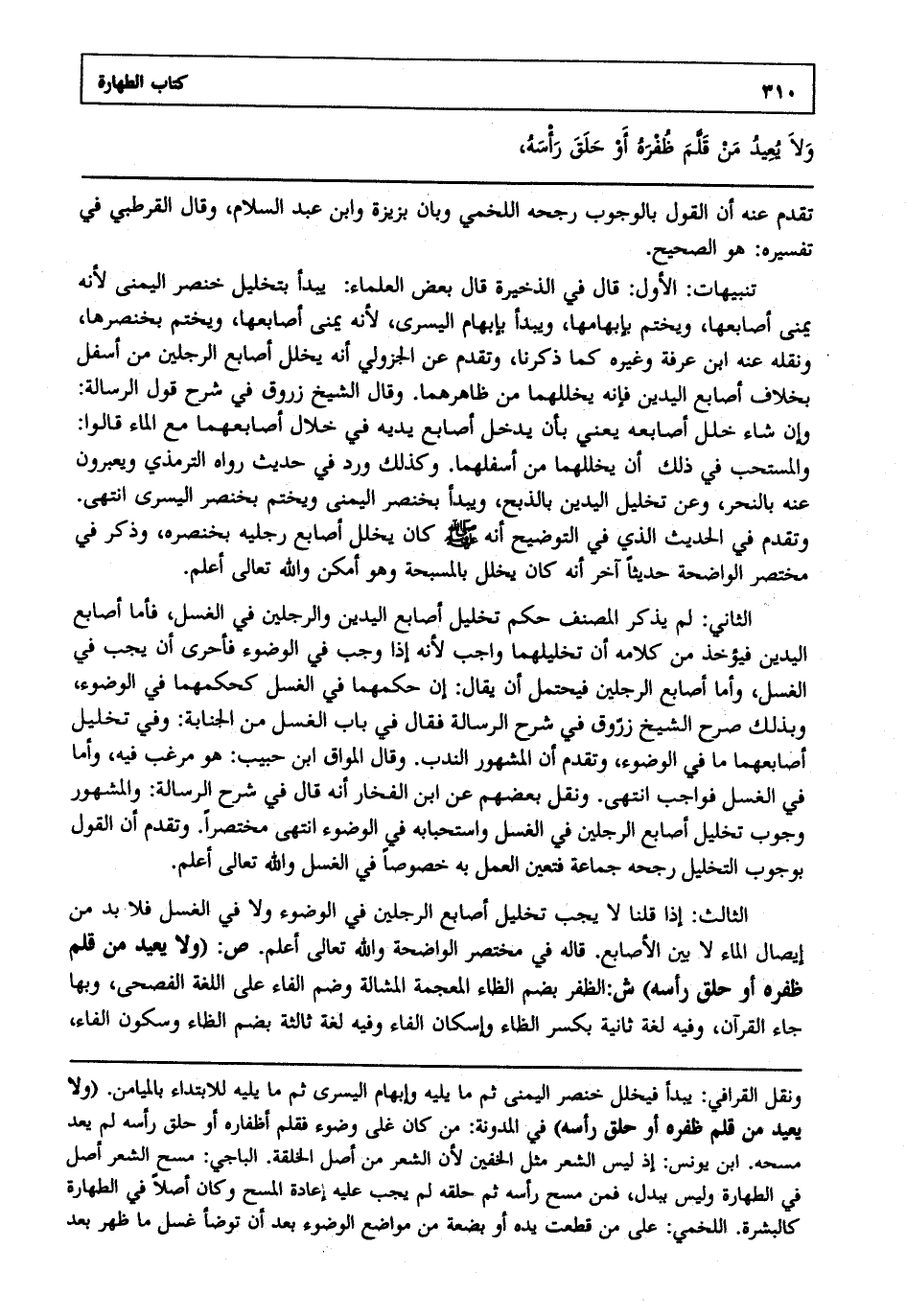 الثالث : إذا قلنا لا يجب تخليل أصابع الرجلين في الوضوء ولا في الغسل فلا بد من إيصال الماء لا بين الأصابع قاله في مختصر الواضحة والله تعالى أعلم. ص: "ولا يعيد من قلم ظفره أو حلق رأسه" ش: الظفر بضم الظاء المعجمة الفاء على اللغة الفصحى وبها جاء القرآن وفيه لغة ثانية بكسر الظاء وإسكان الفاء وفيه لغة ثالثة بضم الظاء وسكون الفاء،