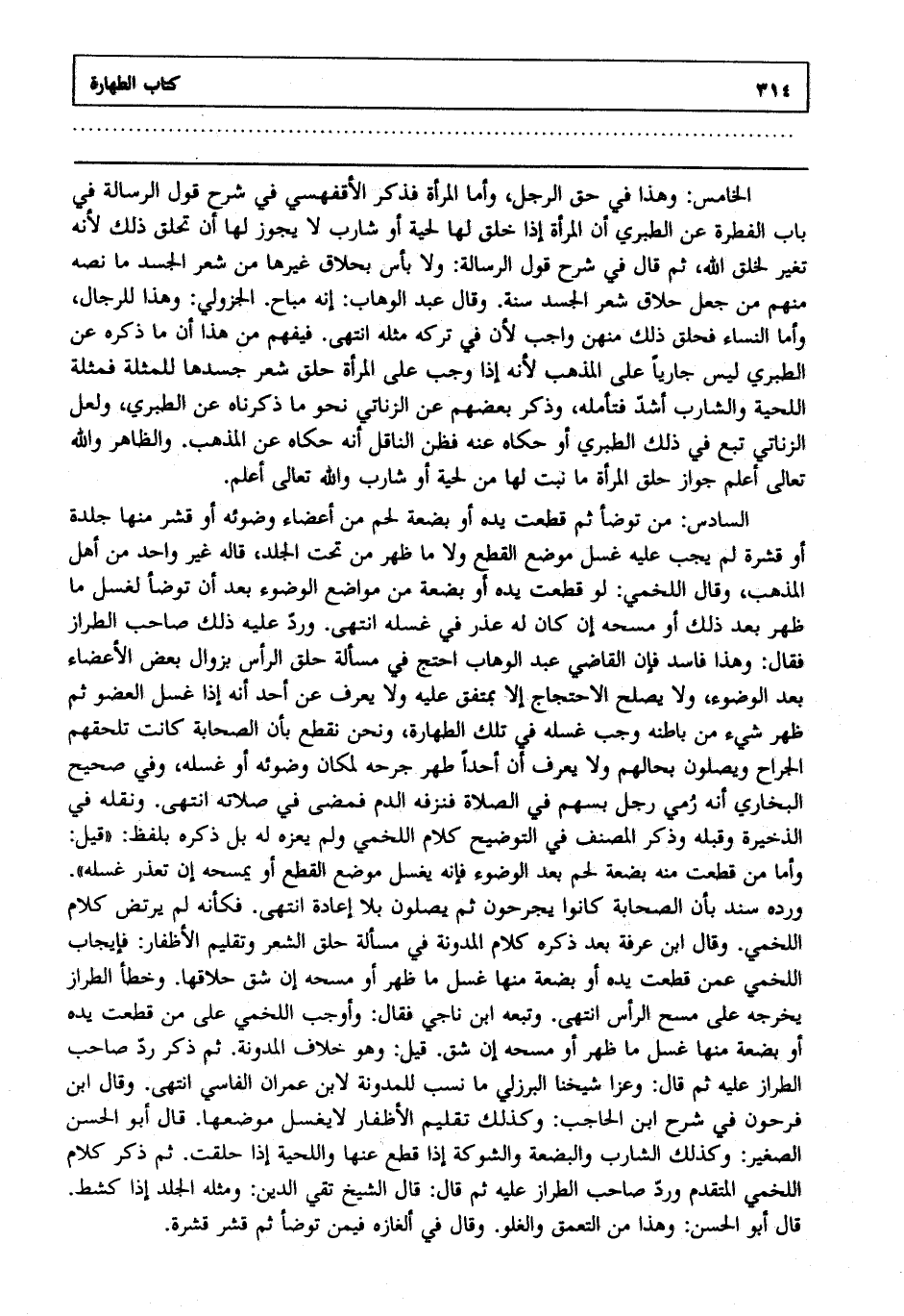 السادس : من توضأ ثم قطعت يده أو بضعة لحم من أعضاء وضوئه أو قشر منها جلدة أو قشرة لم يجب عليه غسل موضع القطع ولا ما ظهر من تحت الجلد قاله غير واحد من أهل المذهب وقال اللخمي لو قطعت يده أو بضعة من مواضع الوضوء بعد أن توضأ لغسل ما ظهر بعد ذلك أو مسحه إن كان له عذر في غسله انتهى. ورد عليه ذلك صاحب الطراز فقال وهذا فاسد فإن القاضي عبد الوهاب احتج في مسألة حلق الرأس بزوال بعض الأعضاء بعد الوضوء ولا يصلح الاحتجاج إلا بمتفق عليه ولا يعرف عن أحد أنه إذا غسل العضو ثم ظهر شيء من باطنه وجب غسله في تلك الطهارة ونحن نقطع بأن الصحابة كانت تلحقهم الجراح ويصلون بحالهم ولا يعرف أن أحدا طهر جرحه لمكان وضوئه أو غسله وفي صحيح البخاري أنه رمي رجل بسهم في الصلاة فنزفه الدم فمضى في صلاته انتهى. ونقله في الذخيرة وقبله وذكر المصنف في التوضيح كلام اللخمي ولم يعزه له بل ذكره بلفظ قيل وأما من قطعت منه بضعة لحم بعد الوضوء فإنه يغسل موضع القطع أو يمسحه إن تعذر غسله ورده سند بأن الصحابة كانوا يجرحون ثم يصلون بلا إعادة انتهى. فكأنه لم يرتض كلام اللخمي وقال ابن عرفة بعد ذكره كلام المدونة في مسألة حلق الشعر وتقليم الأظفار: فإيجاب اللخمي عمن قطعت يده أو بضعة منها غسل ما ظهر أو مسحه إن شق حلاقها وخطأ الطراز يخرجه على مسح الرأس انتهى. ابن ناجي فقال وأوجب اللخمي على من قطعت يده أو بضعة منها غسل ما ظهر أو مسحه إن شق قيل وهو خلاف المدونة ثم ذكر رد صاحب الطراز عليه ثم قال وعزا شيخنا البرزلي ما نسب للمدونة لابن عمران الفاسي انتهى. وقال ابن فرحون في شرح ابن الحاجب: وكذلك تقليم الأظفار لايغسل موضعها قال أبو الحسن الصغير: وكذلك الشارب والبضعة والشوكة إذا قطع عنها واللحية إذا حلقت ثم ذكر كلام اللخمي المتقدم ورد صابب الطراز عليه ثم قال قال الشيخ تقي الدين: ومثله الجلد إذا كشط قالأبو الحسن وهذا من التعمق والغلو وقال في ألغازه فيمن توضأ ثم قشر قشرة.