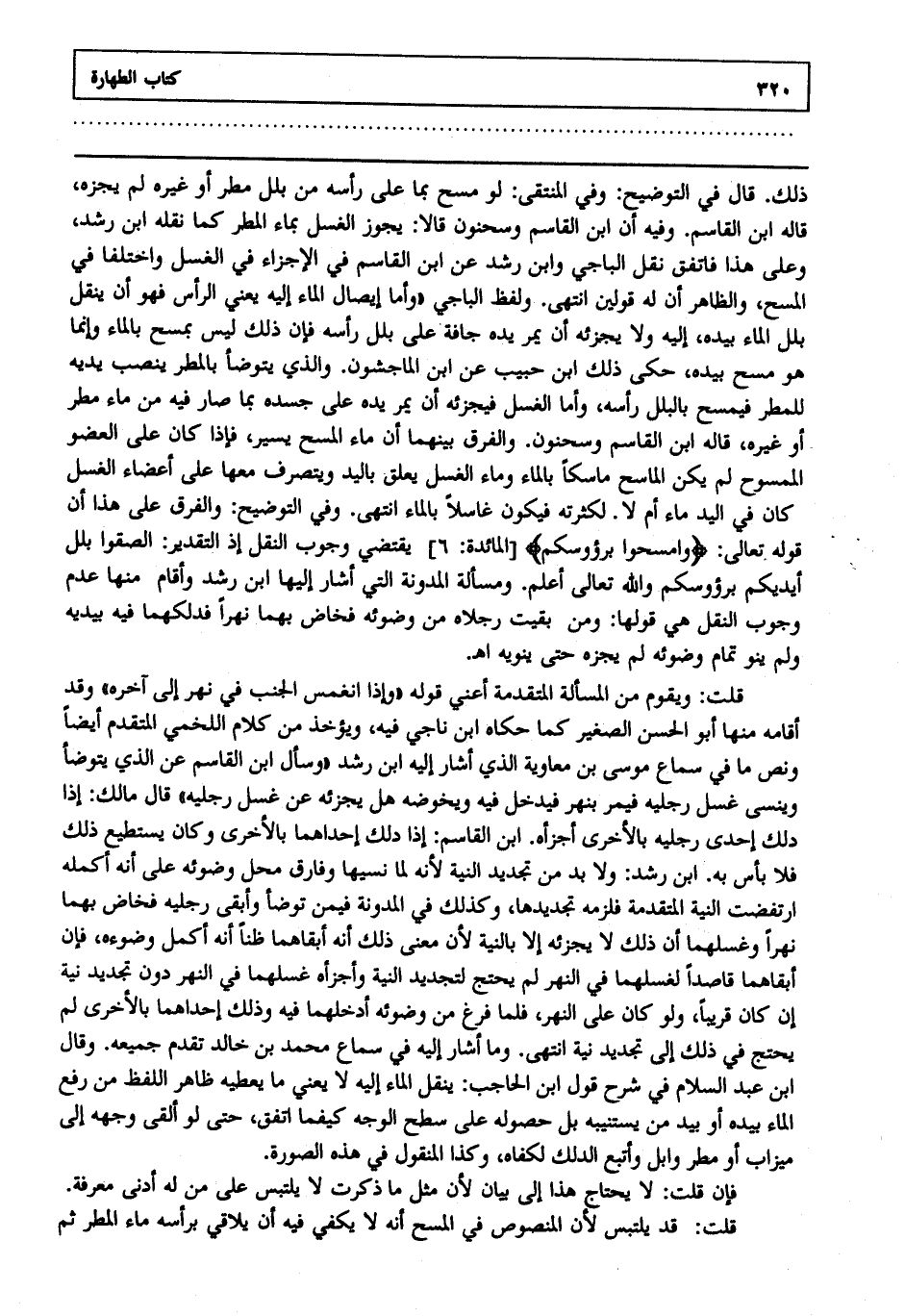 ذلك قال في التوضيح: وفي المنتقى: لو مسح بما على رأسه من بلل مطر أو غيره قاله ابن القاسم وفيه أن ابن القاسم وسحنون قالا يجوز الغسل بماء المطر كما نقله ابن رشد وعلى هذا فاتفق نقل الباجي وابن رشد عن ابن القاسم في الإجزاء في الغسل واختلفا في المسح والظاهر أن له قولين انتهى. ولفظ الباجي وأما إيصال الماء إليه يعني الرأس فهو أن ينقل بلل الماء بيده إليه ولا يجزئه أن يمر يده جافة على بلل رأسه فإن ذلك ليس بمسح بالماء وإنما هو مسح بيده حكى ذلك ابن حبيب عن ابن الماجشون والذي يتوضأ بالمطر ينصب يديه للمطر فيمسح بالبلل رأسه وأما الغسل فيجزئه أن يمر يده على جسده بما صار فيه من ماء مطر أو غيره قاله ابن القاسم وسحنون والفرق بينهما أن ماء المسح يسير فإذا كان على العضو الممسوح لم يكن الماسح ماسكا بالماء وماء الغسل يعلق باليد ويتصرف معها على أعضاء الغسل كان في اليد ماء أم لا لكثرته فيكون غاسلا بالماء انتهى. وفي التوضيح والفرق على هذا أن قوله تعالى: {وَامْسَحُوا بِرُؤُوسِكُمْ} [المائدة: 6] يقتضي وجوب النقل إذ التقدير الصقوا بلل أيديكم برؤوسكم والله تعالى أعلم. ومسألة المدونة التي أشار إليها ابن رشد وأقام منها عدم وجوب النقل هي قولها رجلاه من وضوئه فخاض بهما نهرا فدلكهما فيه بيديه ولم ينو تمام وضوئه لم يجزه حتى ينويه اهـ.