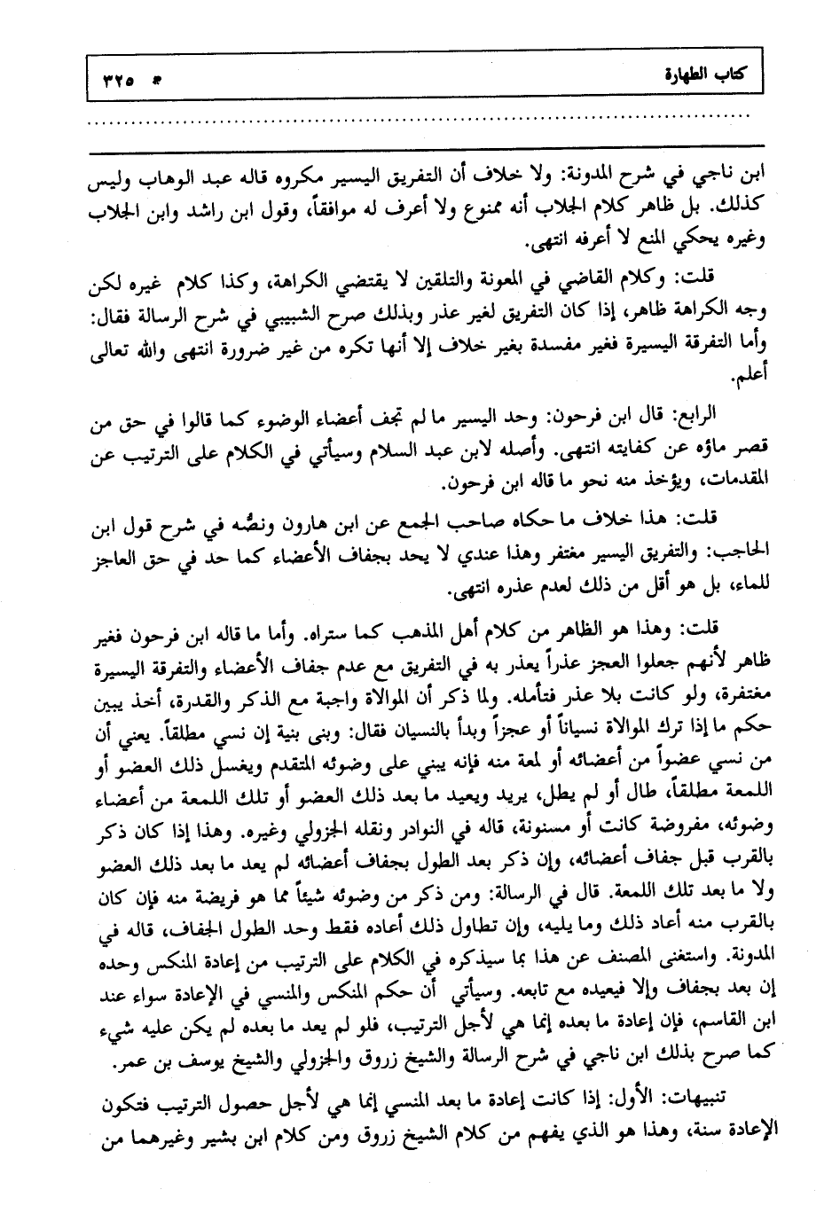 الرابع : قال ابن فرحون: وحد اليسير ما لم تجف أعضاء الوضوء كما قالوا في حق من قصر ماؤه عن كفايته انتهى. وأصله لابن عبد السلام وسيأتي في الكلام على الترتيب عن المقدمات ويؤخذ منه نحو ما قاله ابن فرحون.