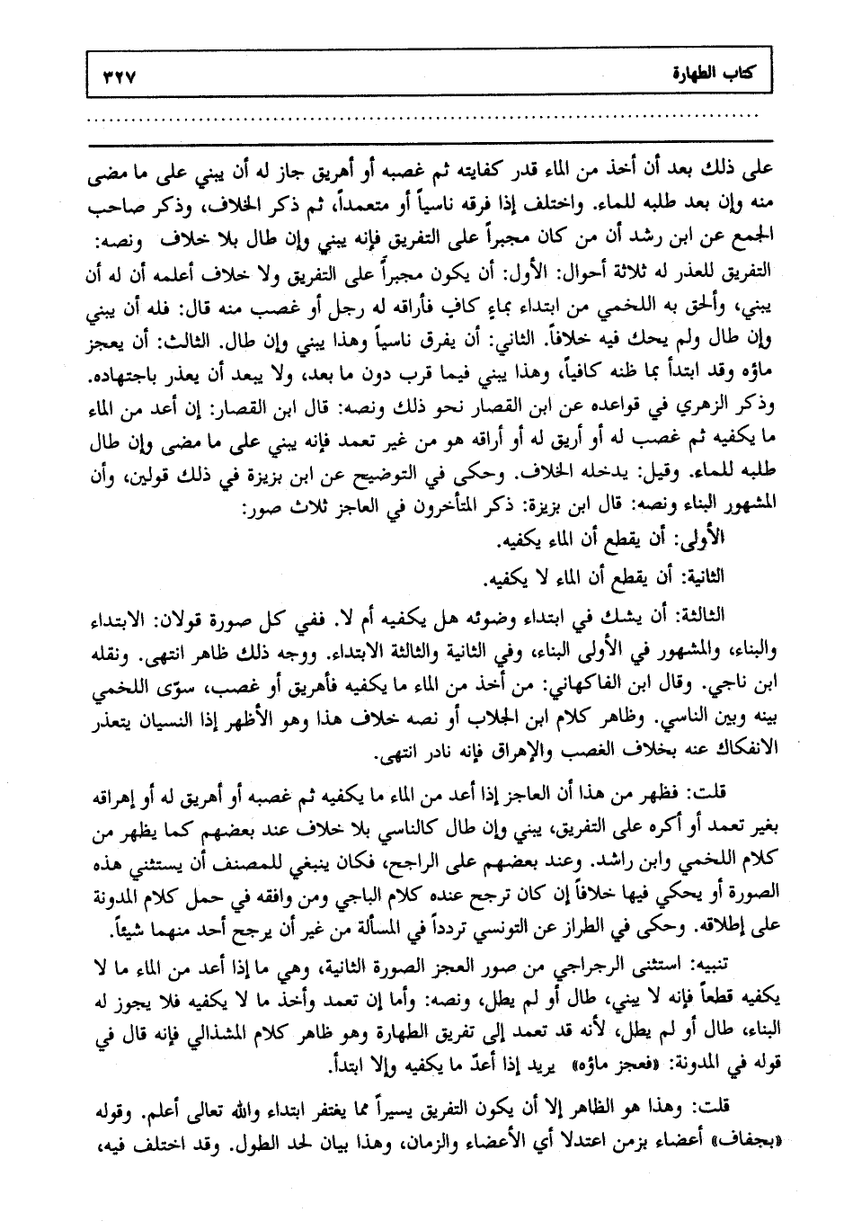 الثالثة : أن يشك في ابتداء وضوئه هل يكفيه أم لا ففي كل صورة قولان الابتداء والبناء والمشهور في الأولى البناء وفي الثانية والثالثة الابتداء ووجه ذلك ظاهر انتهى. ونقله ابن ناجي وقال ابن الفاكهاني من أخذ من الماء ما يكفيه فأهريق أو غصب سوى اللخمي بينه وبين الناسي وظاهر كلام ابن الجلاب أو نصه خلاف هذا وهو الأظهر إذا النسيان يتعذر الانفكاك عنه بخلاف الغصب والإهراق فإنه نادر انتهى.