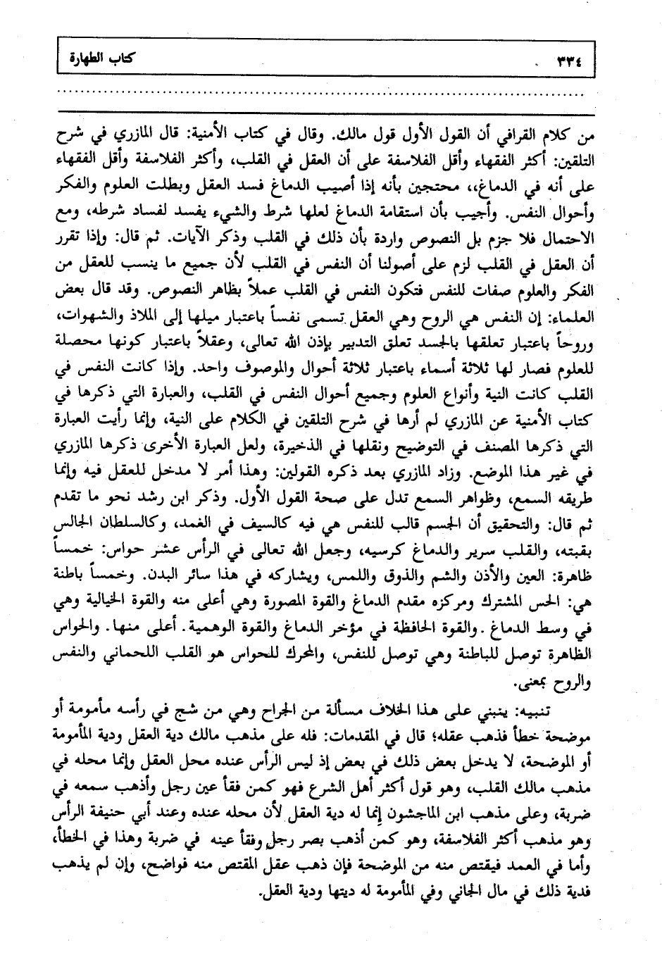 من كلام القرافي أن القول الأول قول مالك وقال في كتاب الأمنية قال المازري في شرح التلقين أكثر الفقهاء وأقل الفلاسفة على أن العقل في القلب وأكثر الفلاسفة وأقل الفقهاء على أنه في الدماغ محتجين بأنه إذا أصيب الدماغ فسد العقل وبطلت العلوم والفكر وأحوال النفس وأجيب بأن استقامة الدماغ لعلها شرط والشيء يفسد لفساد شرطه ومع الاحتمال فلا جزم بل النصوص واردة بأن ذلك في القلب وذكر الآيات ثم قال وإذا تقرر أن العقل في القلب لزم على أصولنا أن النفس في القلب لأن جميع ما ينسب للعقل من الفكر والعلوم صفات للنفس فتكون النفس في القلب عملا بظاهر النصوص وقد قال بعض العلماء إن النفس هي الروح وهي العقل تسمى نفسا باعتبار ميلها إلى الملاذ والشهوات وروحا باعتبار تعلقها بالجسد تعلق التدبير بإذن الله تعالى وعقلا باعتبار كونها محصلة للعلوم فصار لها ثلاثة أسماء باعتبار ثلاثة أحوال والموصوف واحد وإذا كانت النفس في القلب كانت النية وأنواع أحوال النفس في القلب والعبارة التي ذكرها في كتاب الأمنية عن المازري لم أرها في شرح التلقين في الكلام على النية وإنما رأيت العبارة التي ذكرها المصنف في التوضيح ونقلها في الذخيرة ولعل العبارة الأخرى ذكرها المازري هذا الموضع وزاد المازري بعد ذكره القولين وهذا أمر لا مدخل للعقل فيه وإنما تدل على صحة القول الأول وذكر ابن رشد نحو ما تقدم ثم قال والتحقيق أن الجسم قالب للنفس هي فيه كالسيف في الغمد وكالسلطان الجالس بقبته والقلب سرير والدماغ كرسيه وجعل الله تعالى في الرأس عشر حواس خمسا ظاهرة العين والأذن والشم والذوق واللمس ويشاركه في هذا سائر البدن وخمسا باطنة هي الحس المشترك ومركزه مقدم الدماغ والقوة المصورة وهي أعلى منه والقوة الخيالية وهي في وسط الدماغ والقوة الحافظة في مؤخر الدماغ والقوة الوهمية أعلى منها والحواس الظاهرة توصل للباطنة وهي توصل للنفس والمحرك للحواس هو القلب اللحماني والنفس والروح بمعنى.