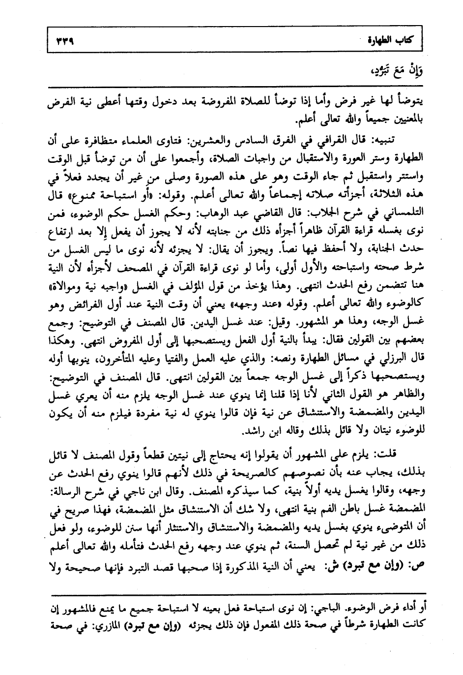 قلت: يلزم على المشهور أن يقولوا إنه يحتاج إلى نيتين قطعا وقول المصنف لا قائل بذلك يجاب عنه بأن نصوصهم كالصريحة في ذلك لأنهم قالوا ينوي رفع الحدث عن وجهه وقالوا يغسل يديه أولا بنية كما سيذكره المصنف وقال ابن ناجي في شرح الرسالة: المضمضة غسل باطن الفم بنية انتهى. ولا شك أن الاستنشاق مثل المضمضة فهذا صريح في أن المتوضئ ينوي بغسل يديه والمضمضة والاستنشاق والاستنثار أنها سنن للوضوء ولو فعل ذلك من غير نية لم تحصل السنة ثم ينوي عند وجهه رفع الحدث فتأمله والله تعالى أعلم. ص: "وإن مع تبرد" ش: يعني أن النية المذكورة إذا صحبها قصد التبرد فإنها صحيحة ولا