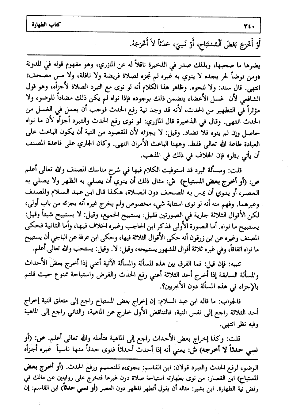 فالجواب: ما قاله ابن عبد السلام إن إخراج بعض المستباح راجع إلى متعلق النية إخراج أحد الثلاثة راجع إلى نفس النية فالتناقض الأول خارج عن الماهية والثاني راجع إلى الماهية وفيه نظر انتهى.