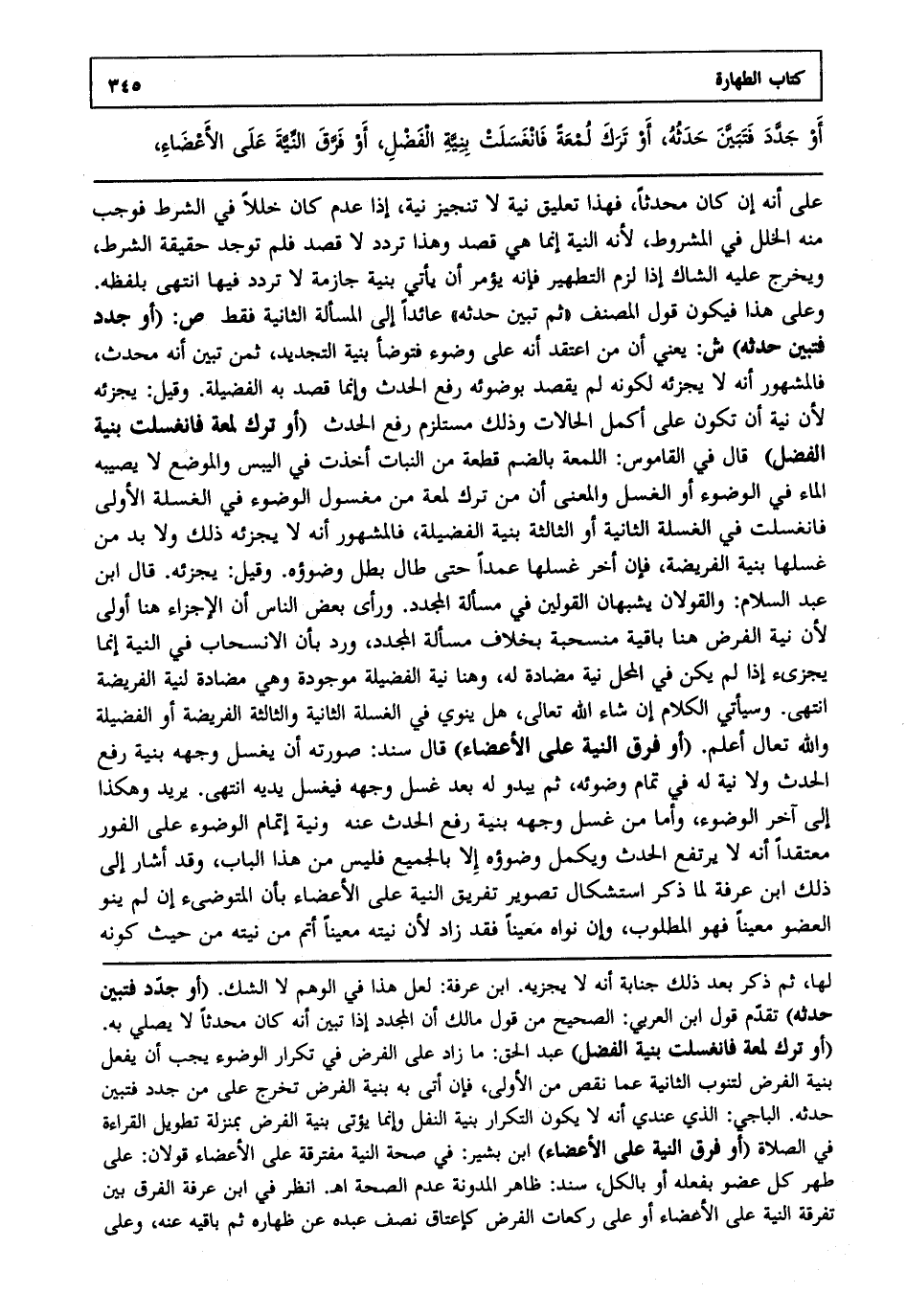 على أنه إن كان محدثا فهذا تعليق نية لا تنجيز نية إذا عدم كان خللا في الشرط فوجب منه الخلل في المشروط لأنه النية إنما هي قصد وهذا تردد لا قصد فلم توجد حقيقة الشرط ويخرج عليه الشاك إذا لزم التطهير فإنه يؤمر أن يأتي بنية جازمة لا تردد فيها انتهى. بلفظه وعلى هذا فيكون قول المصنف ثم تبين حدثه عائدا إلى المسألة الثانية فقط ص: "أو جدد فتبين حدثه" ش: يعني أن من اعتقد أنه على وضوء فتوضأ بنية التجديد ثم تبين أنه محدث فالمشهور أنه لا يجزئه لكونه لم يقصد بوضوئه رفع الحدث وإنما قصد به الفضيلة وقيل يجزئه لأن نية أن تكون على أكمل الحالات وذلك مستلزم رفع الحدث أو ترك لمعة فانغسلت بنية الفضل قال في القاموس اللمعة بالضم قطعة من النبات أخذت في اليبس والموضع لا يصيبه الماء في الوضوء أو الغسل والمعنى أن من ترك لمعة من مغسول الوضوء في الغسلة الأولى فانغسلت في الغسلة الثانية أو الثالثة بنية الفضيلة فالمشهور أنه لا يجزئه ذلك ولا بد من غسلها بنية الفريضة فإن أخر غسلها عمدا حتى طال بطل وضوؤه وقيل يجزئه قال ابن عبد السلام: والقولان يشبهان القولين في مسألة المجدد ورأى بعض الناس أن الإجزاء هنا أولى لأن نية الفرض هنا باقية منسحبة بخلاف مسألة المجدد ورد بأن الانسحاب في النية إنما بجزيء إذا لم يكن في المحل نية مضادة له وهنا نية الفضيلة موجودة وهي مضادة لنية الفريضة انتهى. وسيأتي الكلام إن شاء الله تعالى هل ينوي في الغسلة الثانية والثالثة الفريضة أوالفضيلة والله تعالى أعلم. أو فرق النية على الأعضاء قال سند: صورته أن يغسل وجهه بنية رفع الحدث ولا نية له في تمام وضوئه ثم يبدو له بعد غسل وجهه فيغسل يديه انتهى. يريد وهكذا إلى آخر الوضوء وأما من غسل وجهه بنية رفع الحدث عنه ونية إتمام الوضوء على الفور معتقدا أنه لا يرتفع الحدث ويكمل وضوؤه إلا بالجميع فليس من هذا الباب وقد أشار إلى ذلك ابن عرفة لما ذكر استشكال تصوير تفريق النية على الأعضاء بأن المتوضئ إن لم ينو العضو معينا فهو المطلوب وإن نواه معينا فقد زاد لأن نيته معينا أتم من نيته من حيث كونه