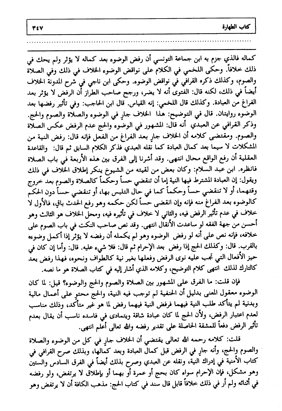 قلت: كلامه رحمه الله تعالى يقتضي أن الخلاف جار في كل من الوضوء والصلاة والصوم والحج وأنه جار في الرفض قبل كمال العبادة وبعد كمالها وبذلك صرح القرافي في كتاب الأمنية في إدراك النية ونقله عن العبدي وصرح بذلك أيضا في الفرق السادس والستين وهو مشكل فإن الإحرام سواء كان بحج أو عمرة أو بهما أو بإطلاق لا يرتفض ولو رفضه في أثنائه ولم أر في ذلك خلافا قابل قال سند في كتاب الحج: مذهب الكافة أن لا يرتفض وهو