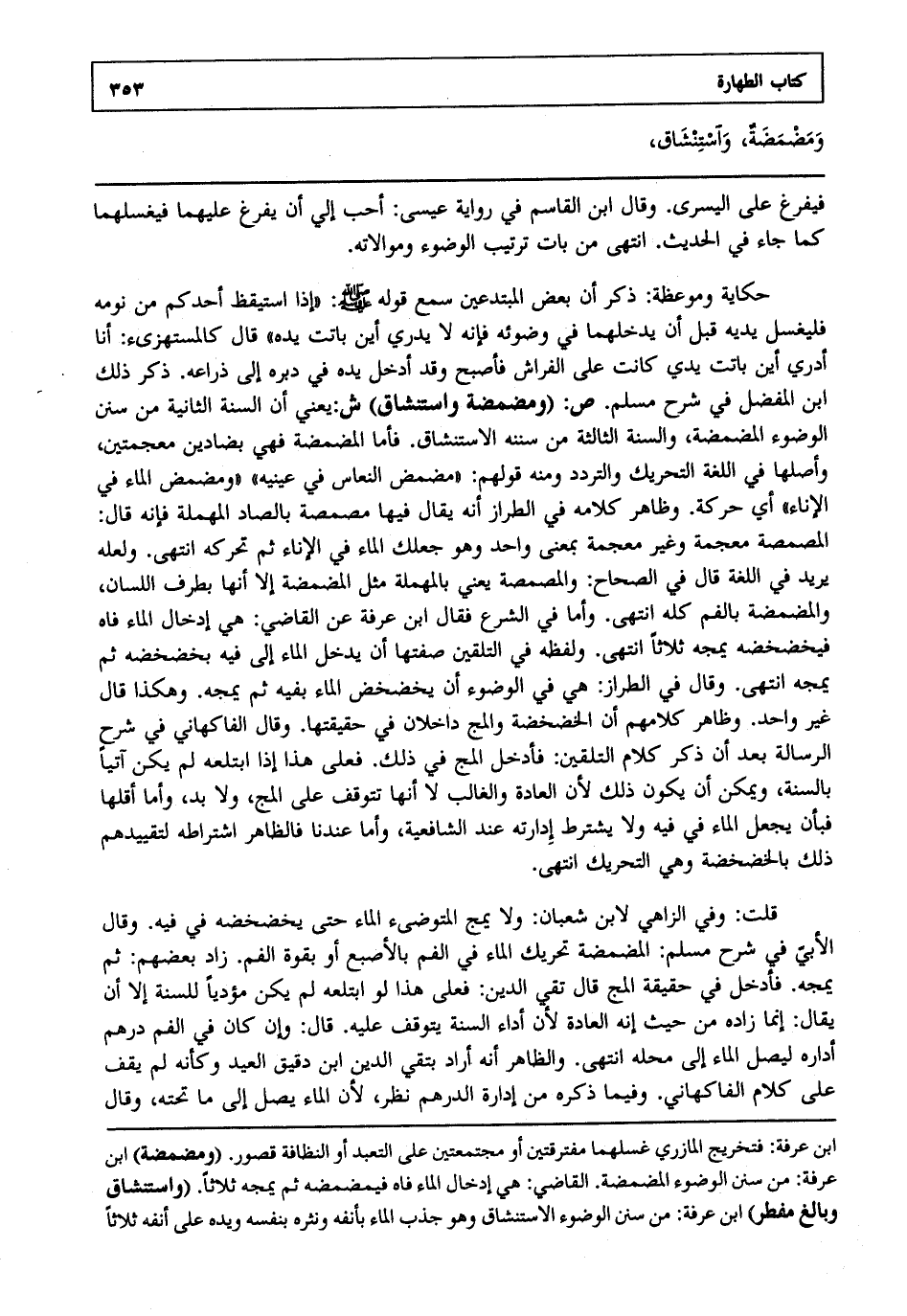 حكاية وموعظة: ذكر أن بعض المبتدعين سمع قوله صلى الله عليه وسلم: "إذا استيقظ أحدكم من نومه فليغسل يديه قبل أن يدخلهما في وضوئه فإنهلا يدري أين باتت يده" قال: كالمستهزئ أنا أدري أين باتت يدي كانت على الفراش فأصبح وقد أدخل يده في دبره إلى ذراعه ذكر ذلك ابن المفضل في شرح مسلم ص: "ومضمضة واستنشاق" ش: يعني أن السنة الثانية من سنن الوضوء المضمضة والسنة الثالثة من سننه الاستنشاق فأما المضمضة فهي بضادين معجمتين وأصلها في اللغة التحريك والتردد ومنه قولهم مضمض النعاس في عينيه ومضمض الماء في الإناء أي حركة وظاهر كلامه في الطراز أنه يقال فيها مصمصة بالصاد المهملة فإنه قال المصمصة معجمة وغير معجمة بمعنى واحد وهو جعلك الماء في الإناء ثم تحركه انتهى. ولعله يريد في اللغة قال في الصحاح: والمصمصة يعني بالمهملة مثل المضمضة إلا أنها بطرف اللسان والمضمضة بالفم كله انتهى. وأما في الشرع فقال ابن عرفة: عن القاضي هي إدخال الماء فاه فيخضخضه يمجه ثلاثا انتهى. ولفظه في التلقين صفتها أن يدخل الماء إلى فيه بخضخضه ثم يمجه انتهى. وقال في الطراز هي في الوضوء أن يخضخض الماء بفيه ثم يمجه وهكذا قال غيرواحد وظاهر كلامهم أن الخضخضة والمج داخلان في حقيقتها وقال الفاكهاني في شرح الرسالة بعد أن ذكر كلام التلقين: فأدخل المج في ذلك فعلى هذا إذا ابتلعه لم يكن آتيا بالسنة ويمكن أن يكون ذلك لأن العادة والغالب لا أنها تتوقف على المج ولا بد وأما أقلها فبأن يجعل الماء في فيه ولا يشترط إدارته عند الشافعية وأما عندنا فالظاهر اشتراطه لتقييدهم ذلك بالخضخضة وهي التحريك انتهى.