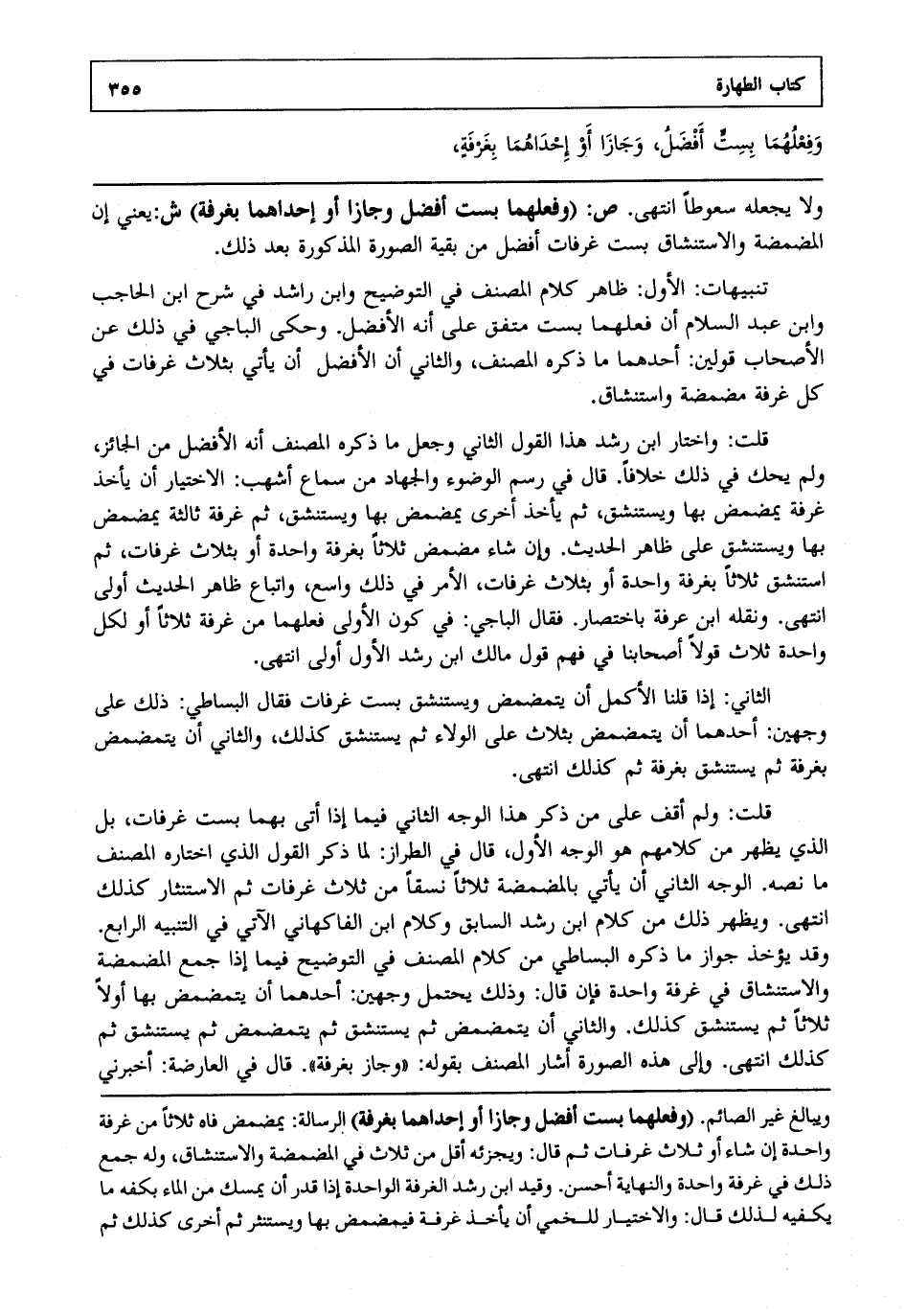 قلت: ولم أقف على من ذكر هذا الوجه الثاني فيما إذا أتى بهما بست غرفات بل الذي يظهر من كلامهم هو الوجه الأول قال في الطراز لما ذكر القول الذي اختاره المصنف ما نصه: الوجه الثاني أن يأتي بالمضمضة ثلاثا نسقا من ثلاث غرفات ثم الاستنثار كذلك انتهى. ويظهر ذلك من كلام ابن رشد السابق وكلام ابن الفاكهاني الآتي في التنبيه الرابع وقد يؤخذ جواز ما ذكره البساطي من كلام المصنف في التوضيح فيما إذا جمع المضمضة والاستنشاق في غرفة واحدة فإن قال وذلك يحتمل وجهين أحدهما أن يتمضمض بها أولا ثلاثا ثم يستنشق كذلك والثاني أن يتمضمض ثم يستنشق ثم يتمضمض ثم يستنشق ثم كذلك انتهى. وإلى هذه الصورة أشار المصنف بقوله وجاز بغرفة قال في العارضة أخبرني