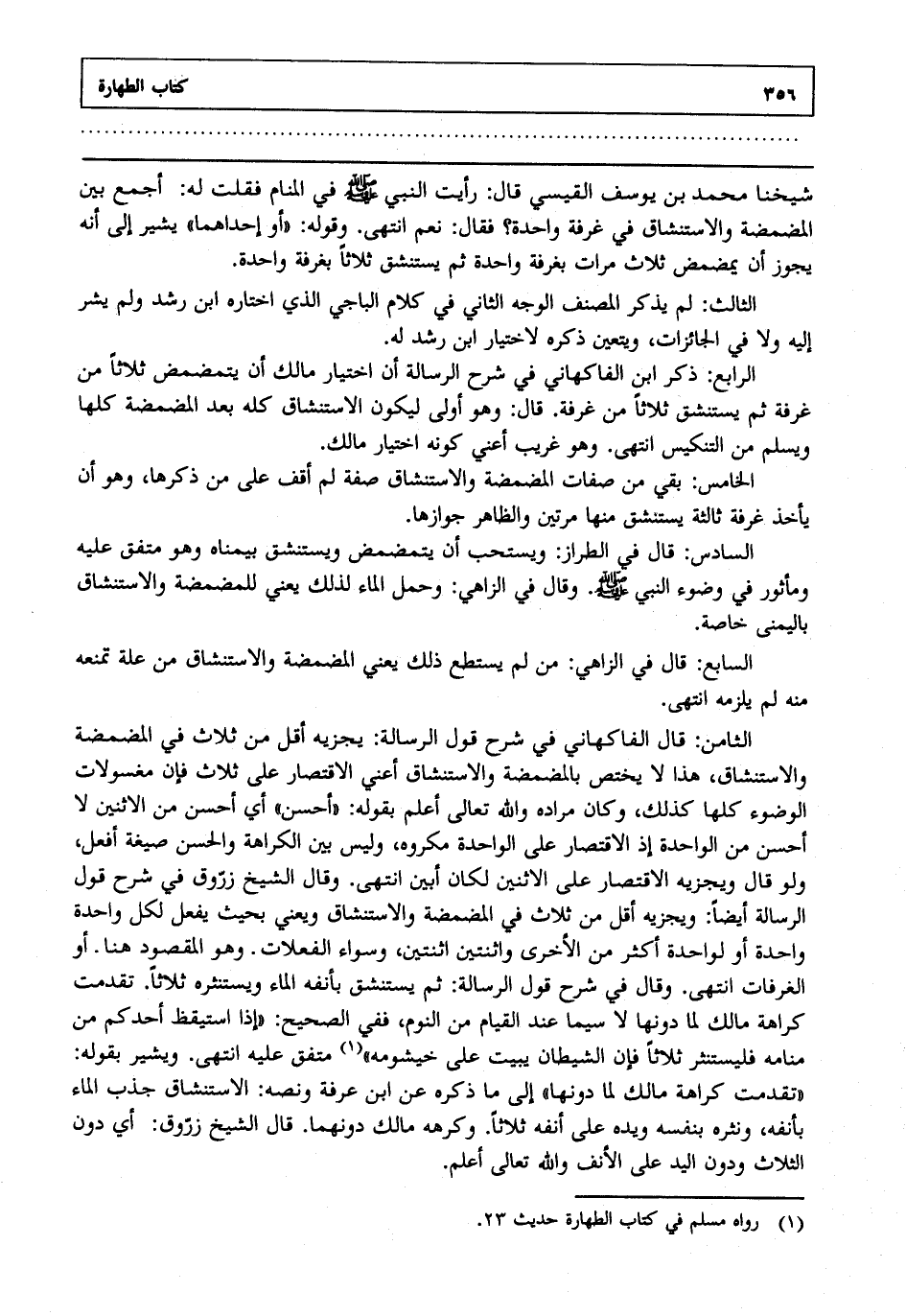 الثامن : قال الفاكهاني في شرح قول الرسالة: يجزيه أقل من ثلاث في المضمضة والاستنشاق هذا لا يختص بالمضمضة والاستنشاق أعني الاقتصار على ثلاث فإن مغسولات الوضوء كلها كذلك وكان مراده والله تعالى أعلم. بقوله أحسن أي أحسن من الاثنين لا أحسن من الواحدة إذ الاقتصار على الواحدة مكروه وليس بين الكراهة والحسن صيغة أفعل ولو قال ويجزيه الاقتصار على الاثنين لكان أبين انتهى. وقال الشيخ زروق في شرح قول الرسالة أيضا: "ويجزيه أقل من ثلاث في المضمضة والاستنشاق": ويعني بحيث يفعل لكل واحدة واحدة أو لواحدة أكثر من الأخرى واثنتين اثنتين وسواء الفعلات وهو المقصود هنا أو الغرفات انتهى. وقال في شرح قول الرسالة ثم يستنشق بأنفه الماء ويستنثره ثلاثا تقدمت كراهة مالك لما دونها لا سيما عند القيام من النوم ففي الصحيح: "إذا استيقظ أحدكم من منامه فليستنثر ثلاثا فإن الشيطان يبيت على خيشومه" 1 متفق عليه انتهى. ويشير بقوله تقدمت كراهة مالك لما دونها إلى ما ذكره عن ابن عرفة ونصه الاستنشاق جذب الماء بأنفه ونثره بنفسه ويده على أنفه ثلاثا وكرهه مالك دونهما قال الشيخ زروق: أي دون الثلاث ودون اليد على الأنف والله تعالى أعلم.