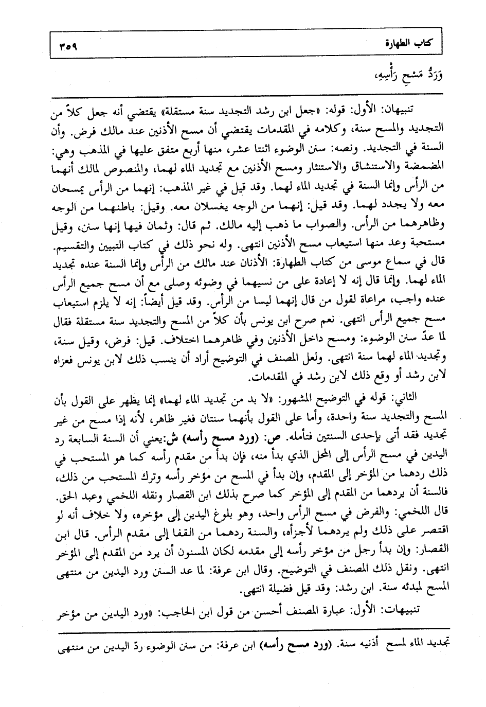 تنبيهان: الأول : قوله جعل ابن رشد التجديد سنة مستقلة يقتضي أنه جعل كلا من التجديد والمسح سنة وكلامه في المقدمات يقتضي أن مسح الأذنين عند مالك فرض وأن السنة في التجديد ونصه سنن الوضوء اثنتا عشر منها أربع متفق عليها في المذهب وهي المضمضة والاستنشاق والاستنثار ومسح الأذنين مع تجديد الماء لهما والمنصوص لمالك أنهما من الرأس وإنما السنة في تجديد الماء لهما وقد قيل في غير المذهب إنهما من الرأس يمسحان معه ولا يجدد لهما وقد قيل إنهما من الوجه يغسلان معه وقيل باطنهما من الوجه وظاهرهما من الرأس والصواب ما ذهب إليه مالك ثم قال وثمان فيها إنها سنن وقيل مستحبة وعد منها استيعاب مسح الأذنين انتهى. وله نحو ذلك في كتاب التبيين والتقسيم قال في سماع موسى من كتاب الطهارة الأذنان عند مالك من الرأس وإنما السنة عنده تجديد الماء لهما وإنما قال إنه لا إعادة على من نسيهما في وضوئه وصلى مع أن مسح جميع الرأس عنده واجب مراعاة لقول من قال إنهما ليسا من الرأس وقد قيل أيضا إنه لا يلزم استيعاب مسح جميع الرأس انتهى. نعم صرح ابن يونس بأن كلا من المسح والتجديد سنة مستقلة فقال لما عد سنن الوضوء ومسح داخل الأذنين وفي ظاهرهما اختلاف قيل فرض وقيل سنة وتجديد الماء لهما سنة انتهى. ولعل المصنف في التوضيح أراد أن ينسب ذلك لابن يونس فعزاه لابن رشد أو وقع ذلك لابن رشد في المقدمات.