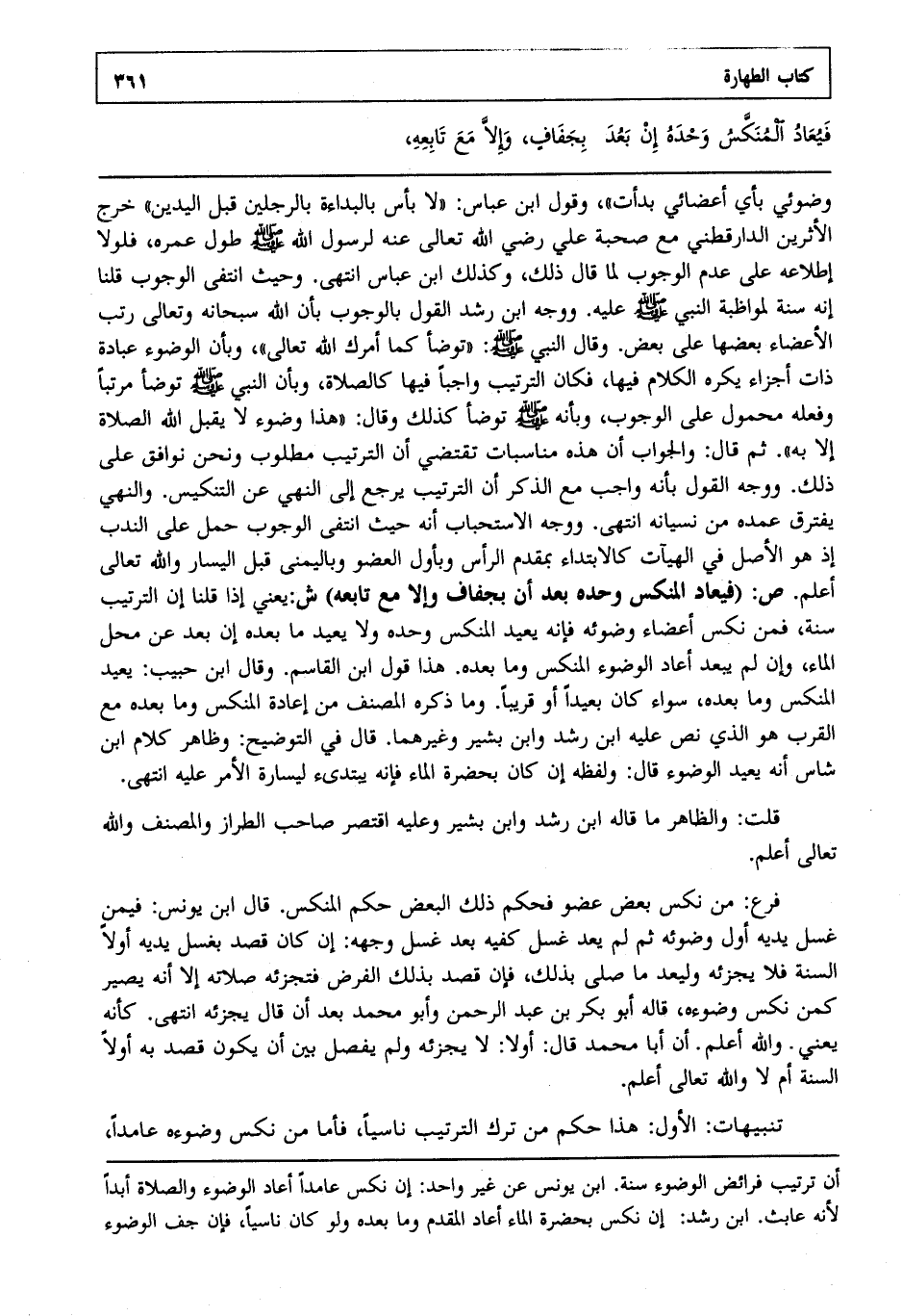 وضوئي بأي أعضائي بدأت وقول ابن عباس لا بأس بالبداءة بالرجلين قبل اليدين خرج الأثرين الدار قطني مع صحبة علي رضي الله تعالى عنه لرسول الله صلى الله عليه وسلم طول عمره فلولا إطلاعه على عدم الوجوب لما قال ذلك وكذلك ابن عباس انتهى. وحيث انتفى الوجوب قلنا إنه سنة لمواظبة النبي صلى الله عليه وسلم عليه ووجه ابن رشد القول بالوجوب بأن الله سبحانه وتعالى رتب الأعضاء بعضها على بعض وقال النبي صلى الله عليه وسلم: "توضأ كما أمرك الله تعالى" وبأن الوضوء عبادة ذات أجزاء يكره الكلام فيها فكان الترتيب واجبا فيها كالصلاة وبأن النبي صلى الله عليه وسلم توضأ مرتبا وفعله محمول على الوجوب وبأنه صلى الله عليه وسلم توضأ كذلك وقال: "هذا وضوء لا يقبل الله الصلاة إلا به" ثم قال: والجواب أن هذه مناسبات تقتضي أن الترتيب مطلوب ونحن نوافق على ذلك ووجه القول بأنه واجب مع الذكر أن الترتيب يرجع إلى النهي عن التنكيس والنهي يفترق عمده من نسيانه انتهى. ووجه الاستحباب أنه حيث انتفى الوجوب حمل على الندب إذ هو الأصل في الهيآت كالابتداء بمقدم الرأس وبأول العضو وباليمنى قبل اليسار والله تعالى أعلم. ص: "فيعاد المنكس وحده بعد أن بجفاف وإلا مع تابعه" ش: يعني إذا قلنا إن الترتيب سنة فمن نكس أعضاء وضوئه فإنه يعيد المنكس وحده ولا يعيد ما بعده أن بعد عن محل الماء وإن لم يبعد أعاد الوضوء المنكس وما بعده هذا قول ابن القاسم وقال ابن حبيب: يعيد المنكس وما بعده سواء كان بعيدا أو قريبا وما ذكره المصنف من إعادة المنكس وما بعده مع القرب هو الذي نص عليه ابن رشد وابن بشير وغيرهما قال في التوضيح: وظاهر كلام ابن شاس أنه يعيد الوضوء قال ولفظه إن كان بحضرة الماء فإنه يبتدئ ليسارة الأمر عليه انتهى.