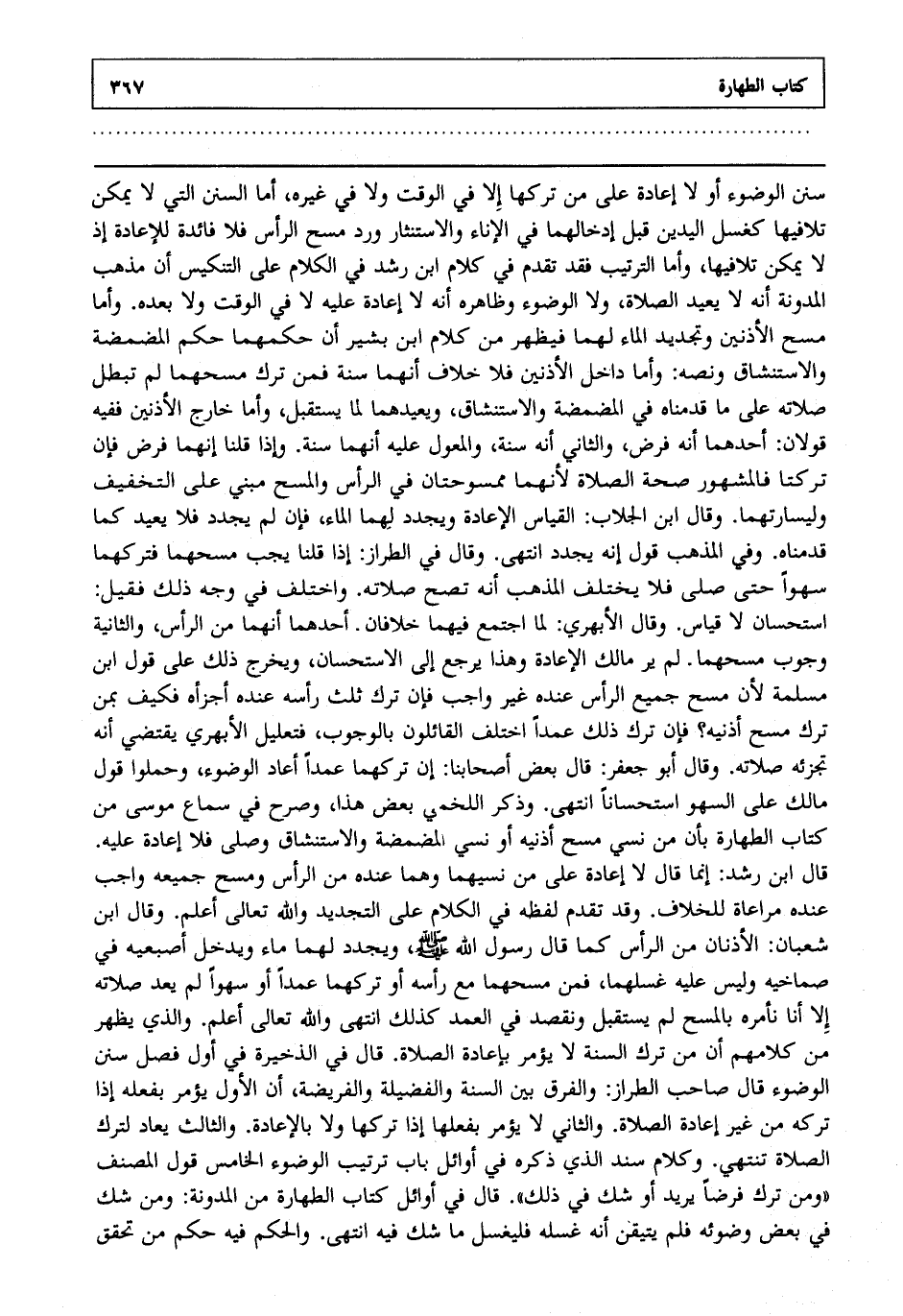 سنن الوضوء أو لا إعادة على من تركها إلا في الوقت ولا في غيره، أما السنن التي لا يمكن تلافيها كغسل اليدين قبل إدخالهما في الإناء والاستنثار ورد مسح الرأس فلا فائدة: للإعادة إذ لا يمكن تلافيها وأما الترتيب فقد تقدم في كلام ابن رشد في الكلام على التنكيس أن مذهب المدونة أنه لا يعيد الصلاة ولا الوضوء وظاهره أنه لا إعادة عليه لا في الوقت ولا بعده وأما مسح الأذنين وتجديد الماء لهما فيظهر من كلام ابن بشير أن حكمهما حكم المضمضة والاستنشاق ونصه وأما داخل الأذنين فلا خلاف أنهما سنة فمن ترك مسحهما لم تبطل صلاته على ما قدمناه في المضمضة والاستنشاق ويعيدهما لما يستقبل وأما خارج الأذنين ففيه قولان أحدهما أنه فرض والثاني أنه سنة والمعول عليه أنهما سنة وإذا قلنا إنهما فرض فإن تركتا فالمشهور صحة الصلاة لأنهما ممسوحتان في الرأس والمسح مبني على التخفيف وليسارتهما وقال ابن الجلاب القياس الإعادة ويجدد لهما الماء فإن لم يجدد فلا يعيد كما قدمناه وفي المذهب قول إنه يجدد انتهى. وقال في الطراز إذا قلنا يجب مسحهما فتركهما سهوا حتى صلى فلا يختلف المذهب أنه تصح صلاته واختلف في وجه ذلك فقيل استحسان لا قياس وقال الأبهري لما اجتمع فيهما خلافان أحدهما أنهما من الرأس والثانية وجوب مسحهما لم ير مالك الإعادة وهذا يرجع إلى الاستحسان ويخرج ذلك على قول ابن مسلمة لأن مسح جميع الرأس عنده غير واجب فإن ترك ثلث رأسه عنده أجزأه فكيف بمن ترك مسح أذنيه فإن ترك ذلك عمدا اختلف القائلون بالوجوب فتعليل الأبهري يقتضي أنه تجزئه صلاته وقال أبو جعفر قال بعض أصحابنا إن تركهما عمدا أعاد الوضوء وحملوا قول مالك على السهو استحسانا انتهى. وذكر اللخمي بعض هذا وصرح في سماع موسى من كتاب الطهارة بأن من نسي مسح أذنيه أو نسي المضمضة والاستنشاق وصلى فلا إعادة عليه قال ابن رشد: إنما قال لا إعادة على من نسيهما وهما عنده من الرأس ومسح جميعه واجب عنده مراعاة للخلاف وقد تقدم لفظه في الكلام على التجديد والله تعالى أعلم. وقال ابن شعبان الأذنان من الرأس كما قال رسول الله صلى الله عليه وسلم ويجدد لهما ماء ويدخل أصبعيه في صماخيه وليس عليه غسلهما فمن مسحهما مع رأسه أو تركهما عمدا أو سهوا لم يعد صلاته إلا أنا نأمره بالمسح لم يستقبل ونقصد في العمد كذلك انتهى. والله تعالى أعلم. والذي يظهر من كلامهم أن من ترك السنة لا يؤمر بإعادة الصلاة قال في الذخيرة في أول فصل سنن الوضوء: قال صاحب الطراز: والفرق بين السنة والفضيلة والفريضة أن الأول يؤمر بفعله إذا تركه من غير إعادة الصلاة والثاني لا يؤمر بفعلها إذا تركها ولا بالإعادة والثالث يعاد لترك الصلاة تنتهي وكلام سند الذي ذكره في أوائل باب ترتيب الوضوء الخامس قول المصنف ومن ترك فرضا يريد أو شك في ذلك قال في أوائل كتاب الطهارة من المدونة ومن شك في بعض وضوئه فلم يتيقن أنه غسله فليغسل ما شك فيه انتهى. والحكم فيه حكم من تحقق