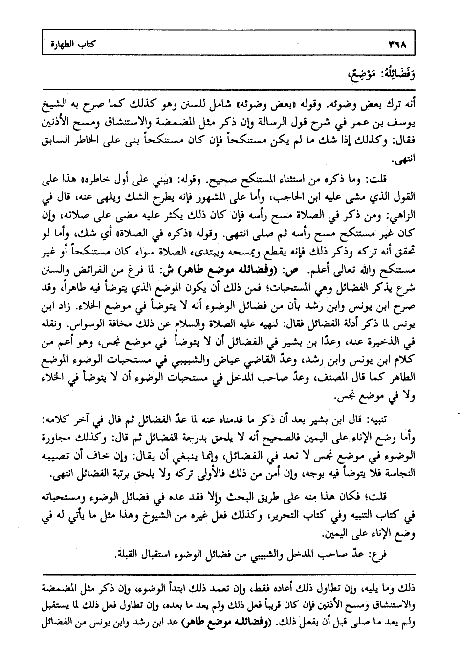قلت: وما ذكره من استثناء المستنكح صحيح وقوله يبني على أول خاطره هذا على القول الذي مشى عليه ابن الحاجب وأما على المشهور فإنه يطرح الشك ويلهى عنه قال في الزاهي ومن ذكر في الصلاة مسح رأسه فإن كان ذلك يكثر عليه مضى على صلاته وإن كان غير مستنكح مسح رأسه ثم صلى انتهى. وقوله: "ذكره في الصلاة" أي شك وأما لو تحقق أنه تركه وذكر ذلك فإنه يقطع ويمسحه ويبتدئ الصلاة سواء كان مستنكحا أو غير مستنكح والله تعالى أعلم. ص: "وفضائله موضع طاهر" ش: لما فرغ من الفرائض والسنن شرع يذكر الفضائل وهي المستحبات فمن ذلك أن يكون الموضع الذي يتوضأ فيه طاهرا وقد صرح ابن يونس وابن رشد بأن من فضائل الوضوء أنه لا يتوضأ في موضع الخلاء زاد ابن يونس لما ذكر أدلة الفضائل فقال لنهيه عليه الصلاة والسلام عن ذلك مخافة الوسواس ونقله في الذخيرة عنه وعدا بن بشير في الفضائل أن لا يتوضأ في موضع نجس وهو أعم من كلام ابن يونس وابن رشد وعد القاضي عياض والشبيبي في مستحبات الوضوء الموضع الطاهر كما قال المصنف وعد صاحب المدخل في مستحبات الوضوء أن لا يتوضأ في الخلاء ولا في موضع نجس.