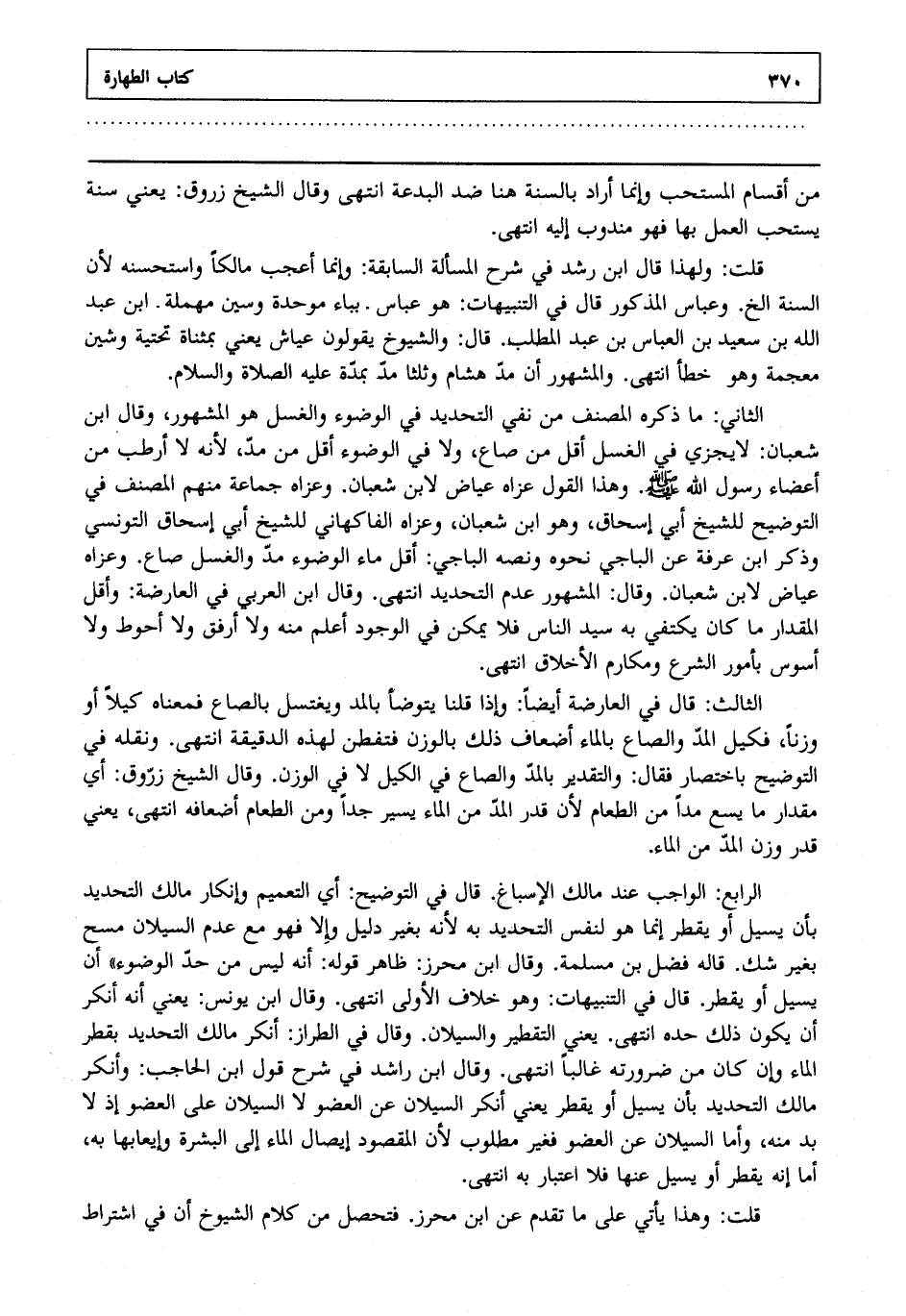 الثالث : قال في العارضة أيضا: وإذا قلنا يتوضأ بالمد ويغتسل بالصاع فمعناه كيلا أو وزنا فكيل المد والصاع بالماء أضعاف ذلك بالوزن فتفطن لهذه الدقيقة انتهى. ونقله في التوضيح باختصار فقال والتقدير بالمد والصاع في الكيل لا في الوزن وقال الشيخ زروق: أي مقدار ما يسع مدا من الطعام لأن قدر المد من الماء يسير جدا ومن الطعام أضعافه انتهى. يعني قدر وزن المد من الماء.