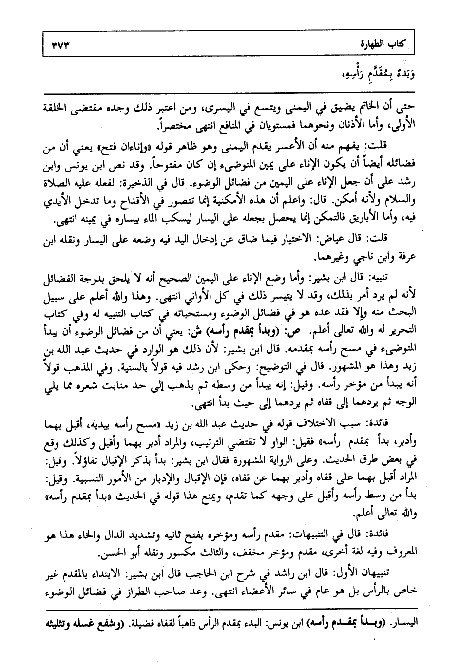 تنبيهان: الأول: قال ابن راشد في شرح ابن الحاجب: قال ابن بشير: الابتداء بالمقدم غير خاص بالرأس بل هو عام في سائر الأعضاء انتهى. وعد صاحب الطراز في فضائل الوضوء