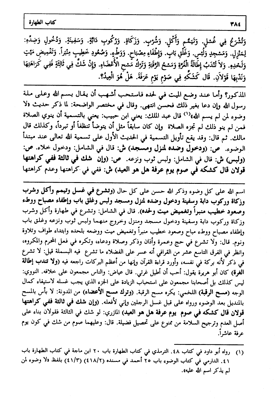 وتشرع في غسل، وتيمم وأكل، وشرب، وزكاة، وركوب دابة، وسفينة ودخول، وضده لمنزل ومسجد، ولبس وغلق باب وإطفاء مصباح ووطء وصعود خطيب منبرا، وتغميض ميت، ولحده، ولا تندب إطالة الغرة، ومسح الرقبة وترك مسح الأعضاء وإن شك في ثالثة ففي كراهتها وندبها قولان قال: كشكه في صوم يوم عرفة هل هو العيد