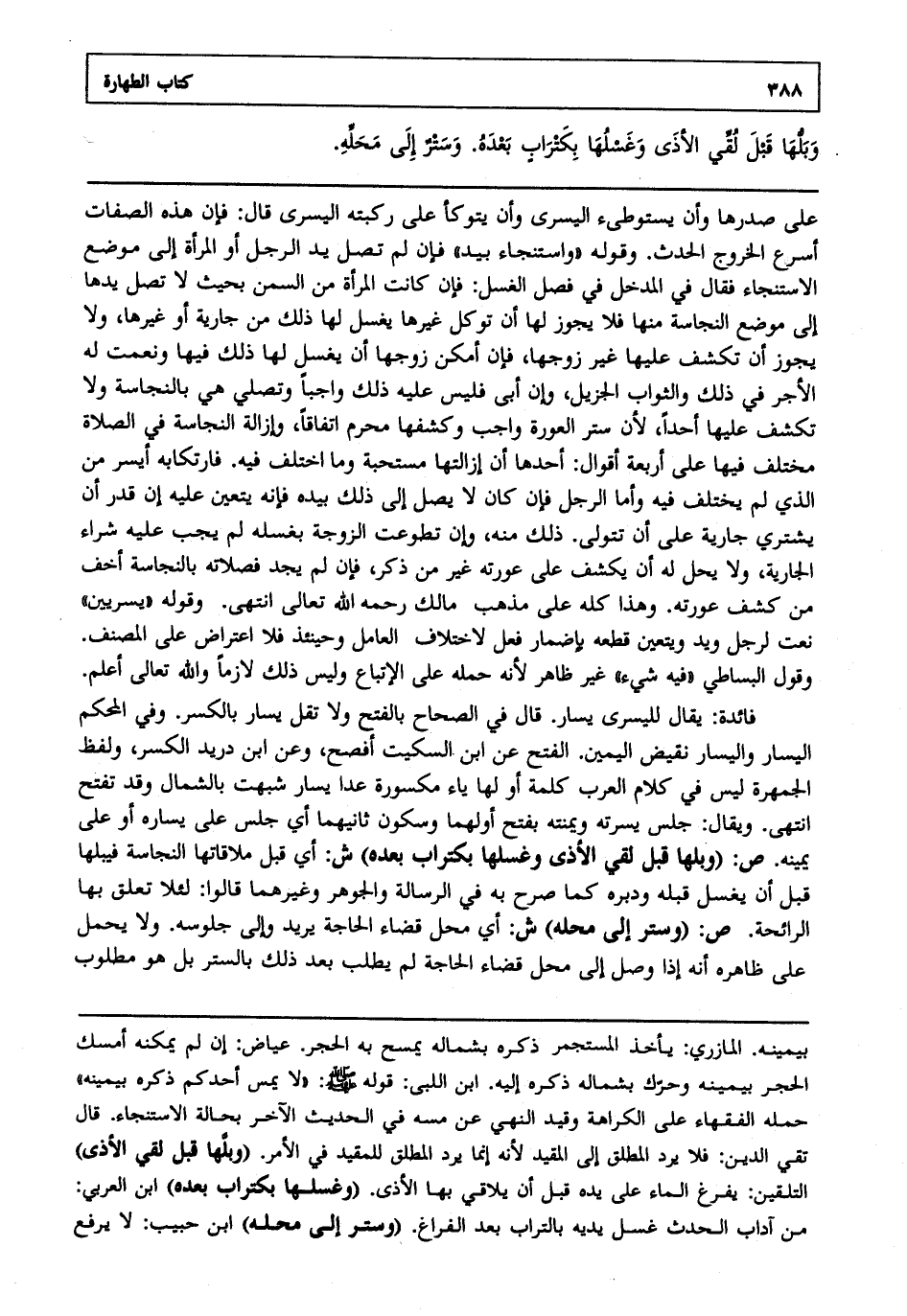 فائدة : يقال لليسرى يسار قال في الصحاح: بالفتح ولا تقل يسار بالكسر وفي المحكم اليسار واليسار نقيض اليمين الفتح عن ابن السكيت أفصح وعن ابن دريد الكسر ولفظ الجمهرة ليس في كلام العرب كلمة أولها ياء مكسورة عدا يسار شبهت بالشمال وقد تفتح انتهى. ويقال جلس يسرته ويمنته بفتح أولهما وسكون ثانيهما أي جلس على يساره أو على يمينه ص: "وبلها قبل لقي الأذى وغسلها بكتراب بعده" ش: أي قبل ملاقاتها النجاسة فيبلها قبل أن يغسل قبله ودبره كما صرح به في الرسالة والجوهر وغيرهما قالوا لئلا تعلق بها الرائحة ص: "وستر إلى محله" ش: أي محل قضاء الحاجة يريد وإلى جلوسه ولا يحمل على ظاهره أنه إذا وصل إلى محل قضاء الحاجة لم يطلب بعد ذلك بالسر بل هو مطلوب
