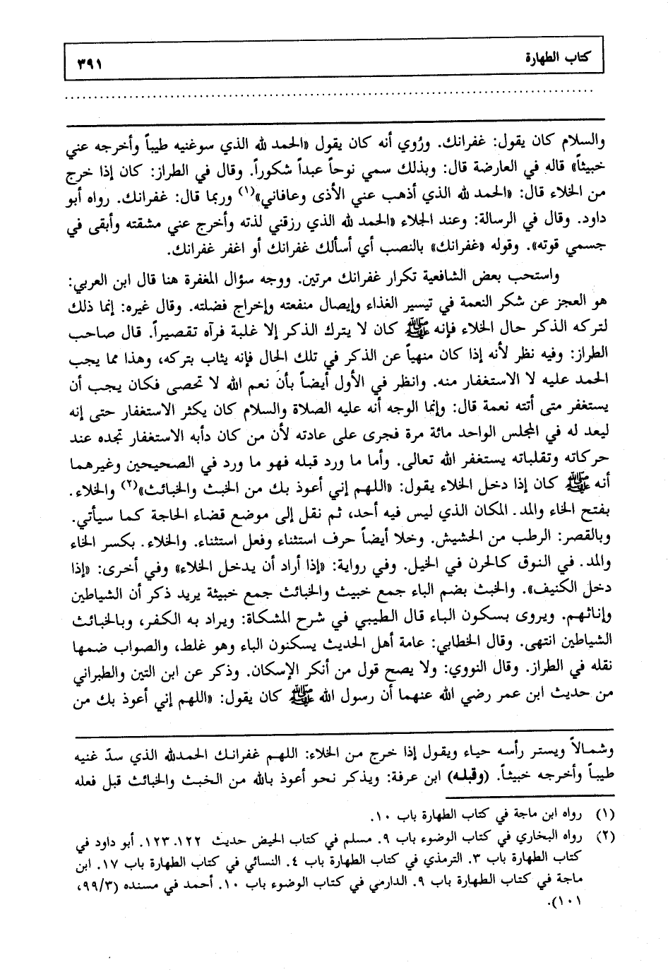 2 رواه البخاري في كتاب الوضوء باب 9. مسلم في كتاب الحيض حديث 122. 123. أبو داود في كتاب الطهارة باب 3. الترمذي في كتاب الطهارة باب 4. النسائي في كتاب الطهارة باب 17. ابن ماجة في كتاب الطهارة باب 9. الدارمي في كتاب الوضوء باب 10. أحمد في مسنده "3/99، 101".