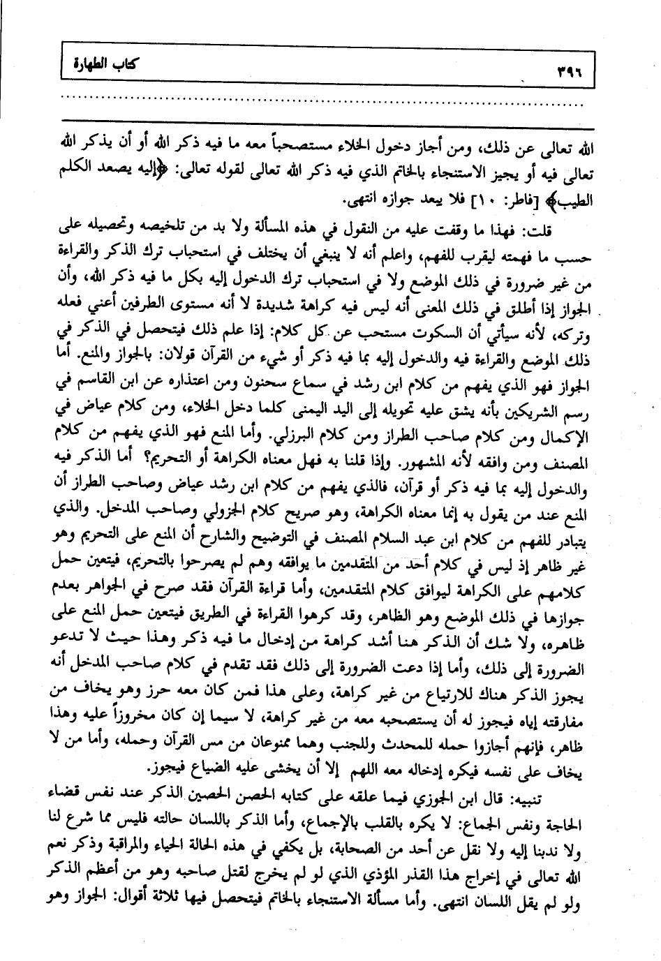 الله تعالى عن ذلك ومن أجاز دخول الخلاء مستصحبا معه ما فيه ذكر الله أو أن يذكر الله تعالى فيه أو يجيز الاستنجاء بالخاتم الذي فيه ذكر الله تعالى لقوله تعالى: {إِلَيْهِ يَصْعَدُ الْكَلِمُ الطيب} [فاطر:10] فلا يبعد جوازه انتهى.