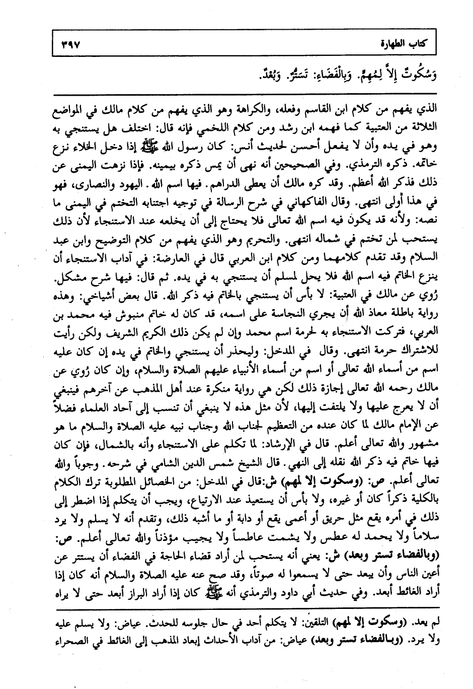 الذي يفهم من كلام ابن القاسم وفعله والكراهة وهو الذي يفهم من كلام مالك في المواضع الثلاثة من العتبية كما فهمه ابن رشد ومن كلام اللخمي فإنه قال اختلف هل يستنجي به وهو في يده وأن لا يفعل أحسن لحديث أنس "كان رسول الله صلى الله عليه وسلم إذا دخل الخلاء نزع خاتمه" ذكره الترمذي وفي الصحيحين "أنه نهى أن يمس ذكره بيمينه" فإذا نزهت اليمنى عن ذلك فذكر الله أعظم وقد كره مالك أن يعطى الدراهم فيها اسم الله اليهود والنصارى فهو في هذا أولى انتهى. وقال الفاكهاني في شرح الرسالة في توجيه اجتنابه التختم في اليمنى ما نصه: ولأنه قد يكون فيه اسم الله تعالى فلا يحتاج إلى أن يخلعه عند الاستنجاء لأن ذلك يستحب لمن تختم في شماله انتهى. والتحريم وهو الذي يفهم من كلام التوضيح وابن عبد السلام وقد تقدم كلامهما ومن كلام ابن العربي قال في العارضة في آداب الاستنجاء أن ينزع الخاتم فيه اسم الله فلا يحل لمسلم أن يستنجي به في يده ثم قال فيها شرح مشكل روي عن مالك في العتبية لا بأس أن يستنجي بالخاتم فيه ذكر الله قال بعض أشياخي وهذه رواية باطلة معاذ الله أن يجري النجاسة على اسمه قد كان له خاتم منبوش فيه محمد بن العربي فتركت الاستنجاء به لحرمة اسم محمد وإن لم يكن ذلك الكريم الشريف ولكن رأيت للاشتراك حرمة انتهى. وقال في المدخل وليحذر أن يستنجي والخاتم في يده إن كان عليه اسم من أسماء الله تعالى أو اسم من أسماء الأنبياء عليهم الصلاة والسلام وإن كان روي عن مالك رحمه الله تعالى إجازة ذلك لكن هي رواية منكرة عند أهل المذهب عن آخرهم فينبغي أن لا يعرج عليها ولا يلتفت إليها لأن مثل هذه لا ينبغي أن تنسب إلى آحاد العلماء فضلا عن الإمام مالك لما كان عنده من التعظيم لجناب الله وجناب نبيه عليه الصلاة والسلام ما هو مشهور والله تعالى أعلم. قال في الإرشاد لما تكلم على الاستنجاء وأنه بالشمال فإن كان فيها خاتم فيه ذكر الله نقله إلى النهي قال الشيخ شمس الدين الشامي في شرحه وجوبا والله تعالى أعلم. ص: "وسكوت إلا لمهم" ش: قال في المدخل من الخصائل المطلوبة ترك الكلام بالكلية ذكرا كان أو غيره ولا بأس أن يستعيذ عند الارتياع ويجب أن يتكلم إذا اضطر إلى ذلك في أمره يقع مثل حريق أو أعمى يقع أو دابة أو ما أشبه ذلك وتقدم أنه لا يسلم ولا يرد سلاما ولا يحمد له عطس ولا يشمت عاطسا ولا يجيب مؤذنا والله تعالى أعلم. ص: "وبالفضاء تستر وبعد" ش: يعني أنه يستحب لمن أراد قضاء الحاجة في الفضاء أن يستتر عن أعين الناس وأن يبعد حتى لا يسمعوا له صوتا وقد صح عنه عليه الصلاة والسلام أنه كان إذا أراد الغائط أبعد وفي حديث أبي داود والترمذي "أنه صلى الله عليه وسلم كان إذا أراد البراز أبعد حتى لا يراه