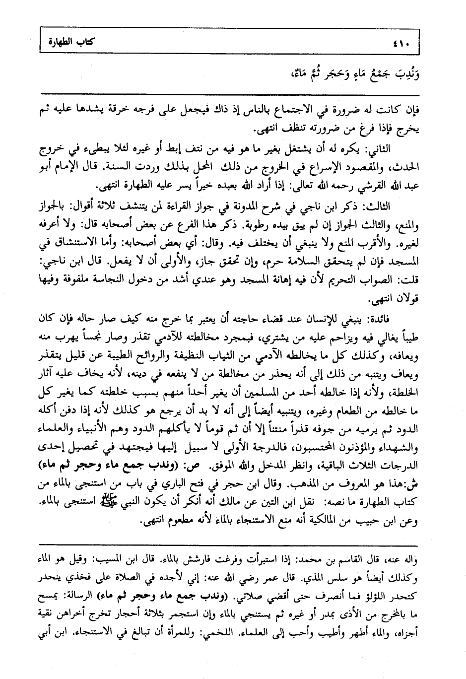 فائدة : ينبغي للإنسان عند قضاء حاجته أن يعتبر بما خرج منه كيف صار حاله فإن كان طيبا يغالي فيه ويزاحم عليه من يشتري فبمجرد مخالطته للآدمي تقذر وصار نجسا يهرب منه ويعافه وكذلك كل ما يخالطه الآدمي من الثياب النظيفة والروائح الطيبة عن قليل يتقذر ويعاف ويتنبه من ذلك إلى أنه يحذر من مخالطة من لا ينفعه في دينه لأنه يخاف عليه آثار الخلطة ولأنه إذا خالطه أحد من المسلمين أن يغير أحدا منهم بسبب خلطته كما يغير كل ما خالطه من الطعام وغيره ويتنبه أيضا إلى أنه لا بد أن يرجع هو كذلك لأنه إذا دفن أكله الدود ثم يرميه من جوفه قذرا منتنا إلا أن ثم قوما لا يأكلهم الدود وهم الأنبياء والعلماء والشهداء والمؤذنون المحتسبون فالدرجة الأولى لا سبيل إليها فيجتهد في تحصيل إحدى الدرجات الثلاث الباقية وانظر المدخل والله الموفق ص: "وندب جمع ماء وحجر ثم ماء" ش: هذا هو المعروف من المذهب وقال ابن حجر في فتح الباري في باب من استنجى بالماء من كتاب الطهارة ما نصه: نقل ابن التين عن مالك أنه أنكر أن يكون النبي صلى الله عليه وسلم استنجى بالماء وعن ابن حبيب من المالكية أنه منع الاستنجاء بالماء لأنه مطعوم انتهى.