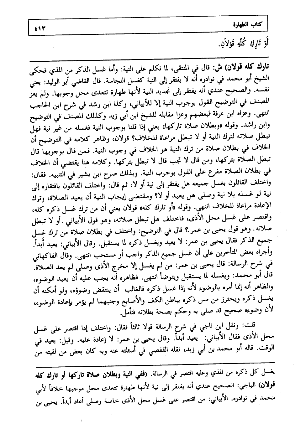 قلت: ونقل ابن ناجي في شرح الرسالة قولا ثالثا فقال واختلف إذا اقتصر على غسل محل الأذى فقال الأبياني يعيد أبدا وقال يحيى بن عمر لا إعادة عليه وقيل يعيد في الوقت قاله أبو محمد بن أبي زيد نقله القفصي في أسئلته عنه وبه كان بعض من لقيته من