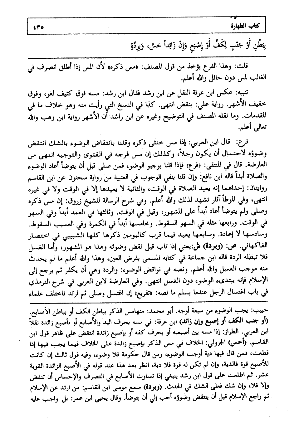 فرع : قال ابن العربي إذا مس خنثى ذكره وقلنا بانتقاض الوضوء بالشك انتقض وضوؤه لاحتمال أن يكون رجلا وكذلك إن مس فرجه في الفتوى والتوجيه انتهى. من العارضة قال في المنتقىفرع: فإذا قلنا بوجوب الوضوء فمن صلى قبل أن يتوضأ أعاد الوضوء والصلاة أبدا قاله ابن نافع وإن قلنا بنفي الوجوب في العتبية من رواية سحنون عن ابن القاسم روايتان إحداهما إنه يعيد الصلاة في الوقت والثانية لا يعيدها إلا في الوقت ولا في غيره انتهى. وفي الموطأ آثار تشهد لذلك والله أعلم. وفي شرح الرسالة للشيخ زروق إن مس ذكره وصلى ولم يتوضأ أعاد أبدا على المشهور وقيل في الوقت وثالثها في العمد أبدا وفي السهو في الوقت ورابعها مثله في السهو السقوط وخامسها أبدا في الكمرة وفي العسيب السقوط وسادسها لا إعادة وسابعها يعيد فيما قرب كاليومين ذكرها كلها الشبيبي في اختصار الفاكهاني ص: "وبردة" ش: يعني إذا تاب قبل نقض وضوئه وهذا هو المشهور وأما الغسل فلا تبطله الردة قاله ابن جماعة في كتابه المسمى بفرض العين وهذا والله أعلم. ما لم يحدث منه موجب الغسل والله أعلم. ونصه في نواقض الوضوء والردة وهي أن يكفر ثم يرجع إلى الإسلام فإنه يبتدئ الوضوء دون الغسل انتهى. وفي العارضة لابن العربي في شرح الترمذي في باب اغتسال الرجل عندما يسلم ما نصه تفريع إن اغتسل وصلى ثم ارتد فاختلف علماء
