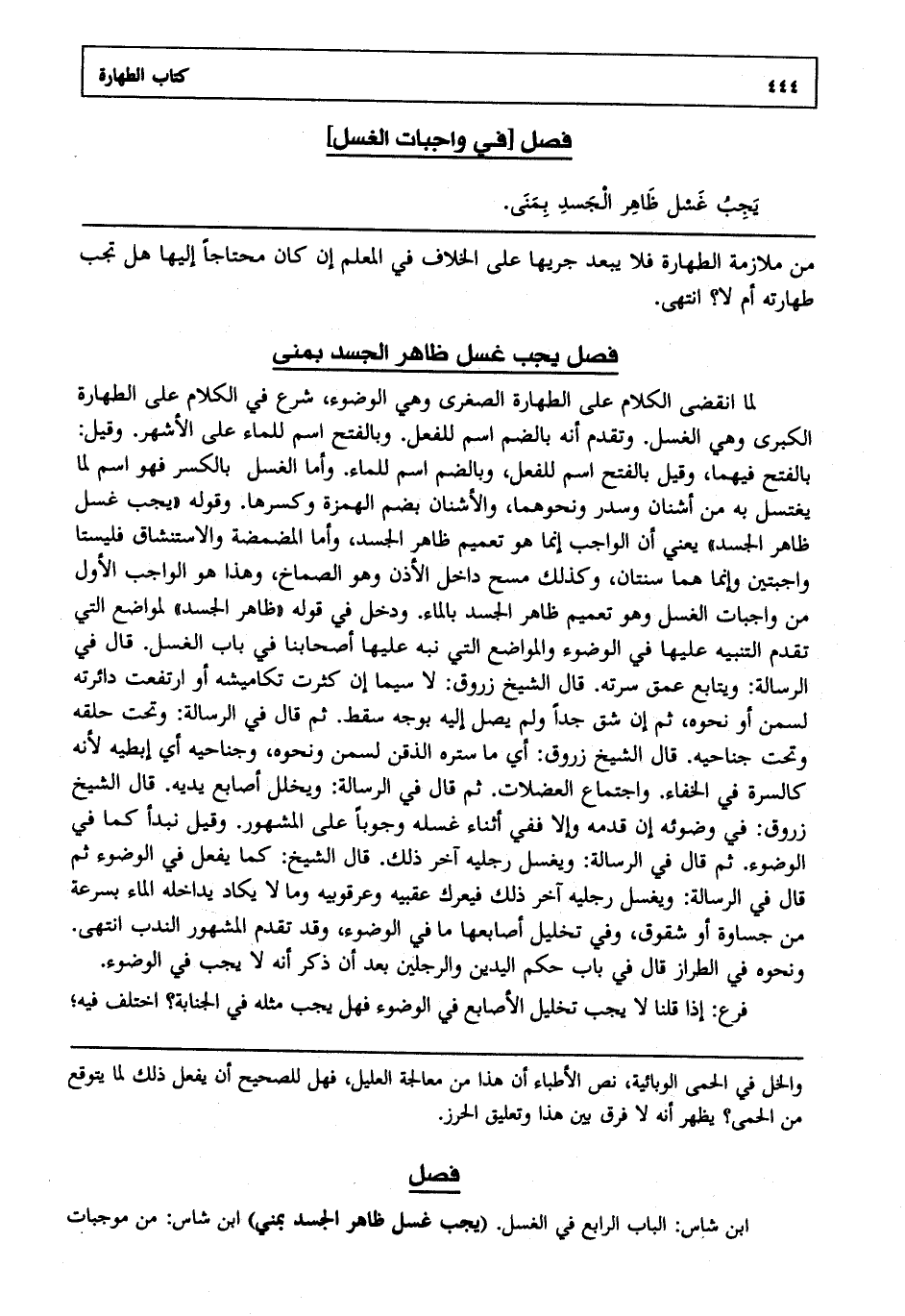 لما انقضى الكلام على الطهارة الصغرى وهي الوضوء شرع في الكلام على الطهارة الكبرى وهي الغسل وتقدم أنه بالضم اسم للفعل وبالفتح اسم للماء على الأشهر وقيل بالفتح فيهما وقيل بالفتح اسم للفعل وبالضم اسم للماء وأما الغسل بالكسر فهو اسم لما يغتسل به من أشنان وسدر ونحوهما والأشنان بضم الهمزة وكسرها وقوله يجب غسل ظاهر الجسد يعني أن الواجب إنما هو تعميم ظاهر الجسد وأما المضمضة والاستنشاق فليستا واجبتين وإنما هما سنتان وكذلك مسح داخل الأذن وهو الصماخ وهذا هو الواجب الأول من واجبات الغسل وهو تعميم ظاهر الجسد بالماء ودخل في قوله ظاهر الجسد لمواضع التي تقدم التنبيه عليها في الوضوء والمواضع التي نبه عليها أصحابنا في باب الغسل قال في الرسالة ويتابع عمق سرته قال الشيخ زروق: لا سيما إن الغرماء تكاميشه أو ارتفعت دائرته لسمن أو نحوه ثم إن شق جدا ولم يصل إليه بوجه سقط ثم قال في الرسالة وتحت حلقه وتحت جناحيه قال الشيخ زروق: أي ما ستره الذقن لسمن ونحوه وجناحيه أي إبطيه لأنه كالسرة في الخفاء واجتماع العضلات ثم قال في الرسالة ويخلل أصابع يديه قال الشيخ زروق: في وضوئه إن قدمه وإلا ففي أثناء غسله وجوبا على المشهور وقيل نبدأ كما في الوضوء ثم قال في الرسالة ويغسل رجليه آخر ذلك قال الشيخ كما يفعل في الوضوء ثم قال في الرسالة ويغسل رجليه آخر ذلك فيعرك عقبيه وعرقوبيه وما لا يكاد يداخله الماء بسرعة من جساوة أو شقوق وفي تخليل أصابعها ما في الوضوء وقد تقدم المشهور الندب انتهى. ونحوه في الطراز قال في باب حكم اليدين والرجلين بعد أن ذكر أنه لا يجب في الوضوء.