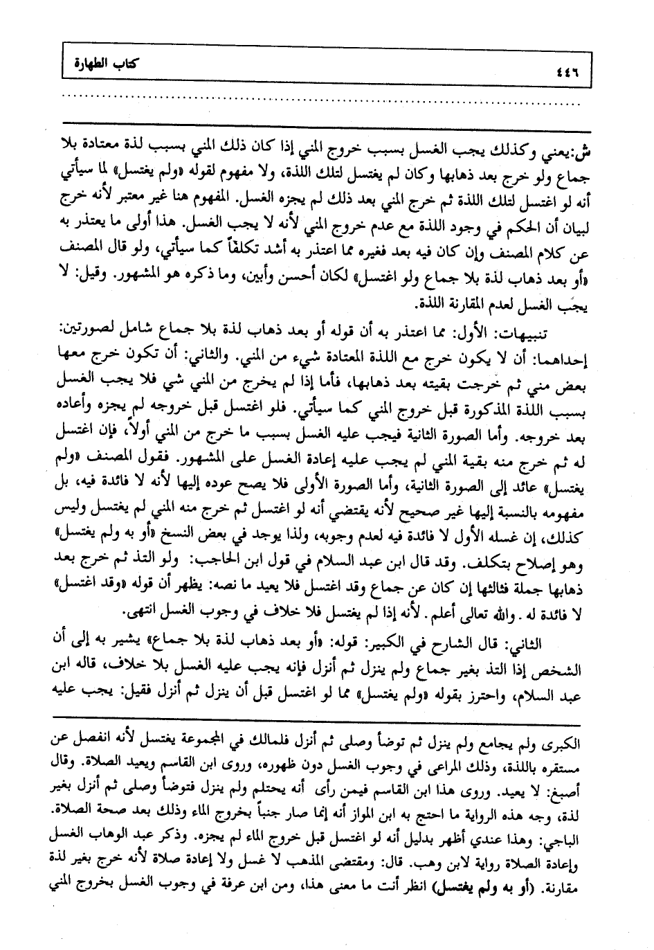 تنبيهات: الأول: مما اعتذر به أن قوله أو بعد ذهاب لذة بلا جماع شامل لصورتين إحداهما أن لا يكون خرج مع اللذة المعتادة شيء من المني والثاني أن تكون خرج معها بعض مني ثم خرجت بقيته بعد ذهابها فأما إذا لم يخرج من المني شي فلا يجب الغسل بسبب اللذة المذكورة قبل خروج المني كما سيأتي فلو اغتسل قبل خروجه لم نجزه وأعاده بعد خروجه وأما الصورة الثانية فيجب عليه الغسل بسبب ما خرج من المني أولا فإن اغتسل له ثم خرج منه بقية المني لم يجب عليه إعادة الغسل على المشهور فقول المصنف ولم يغتسل عائد إلى الصورة الثانية وأما الصورة الأولى فلا يصح عوده إليها لأنه لا فائدة: فيه بل مفهومه بالنسبة إليها غير صحيح لأنه يقتضي أنه لو اغتسل ثم خرج منه المني لم يغتسل وليس كذلك إن غسله الأول لا فائدة: فيه لعدم وجوبه ولذا يوجد في بعض النسخ أو به ولم يغتسل وهو إصلاح بتكلف وقد قال ابن عبد السلام في قول ابن الحاجب: "ولو التذ ثم خرج بعد ذهابها جملة فثالثها إن كان عن جماع وقد اغتسل فلا يعيد" ما نصه: يظهر أن قوله: "وقد اغتسل" لا فائدة: له والله تعالى أعلم. لأنه إذا لم يغتسل فلا خلاف في وجوب الغسل انتهى.