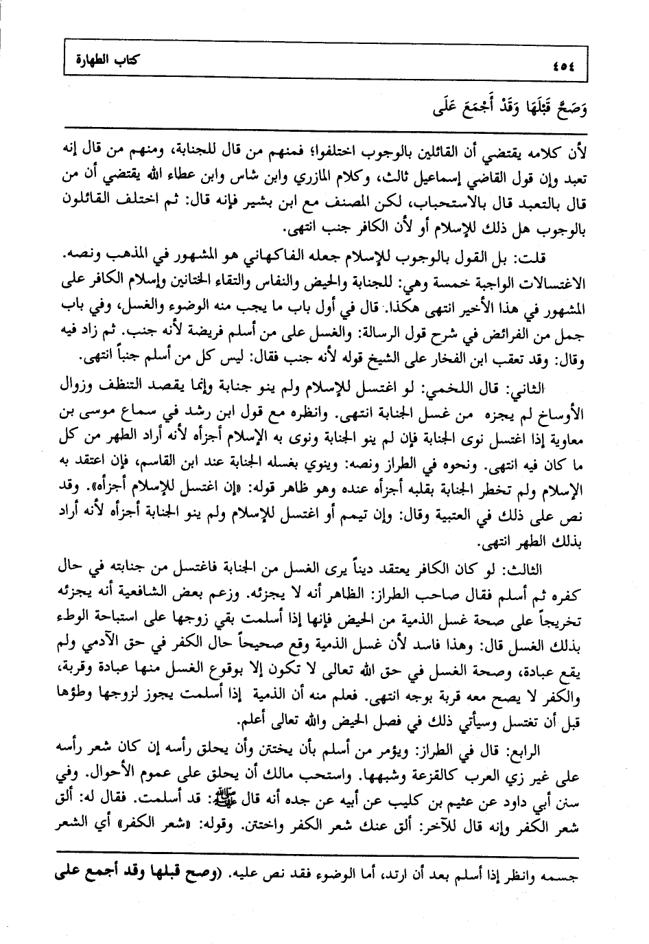 قلت: بل القول بالوجوب للإسلام جعله الفاكهاني هو المشهور في المذهب ونصه الاغتسالات الواجبة خمسة وهي للجنابة والحيض والنفاس والتقاء الختانين وإسلام الكافر على المشهور في هذا الأخير انتهى. هكذا قال في أول باب ما يجب منه الوضوء والغسل وفي باب جمل من الفرائض في شرح قول الرسالة والغسل على من أسلم فريضة لأنه جنب ثم زاد فيه وقال وقد تعقب ابن الفخار على الشيخ قوله لأنه جنب فقال ليس كل من أسلم جنبا انتهى.
