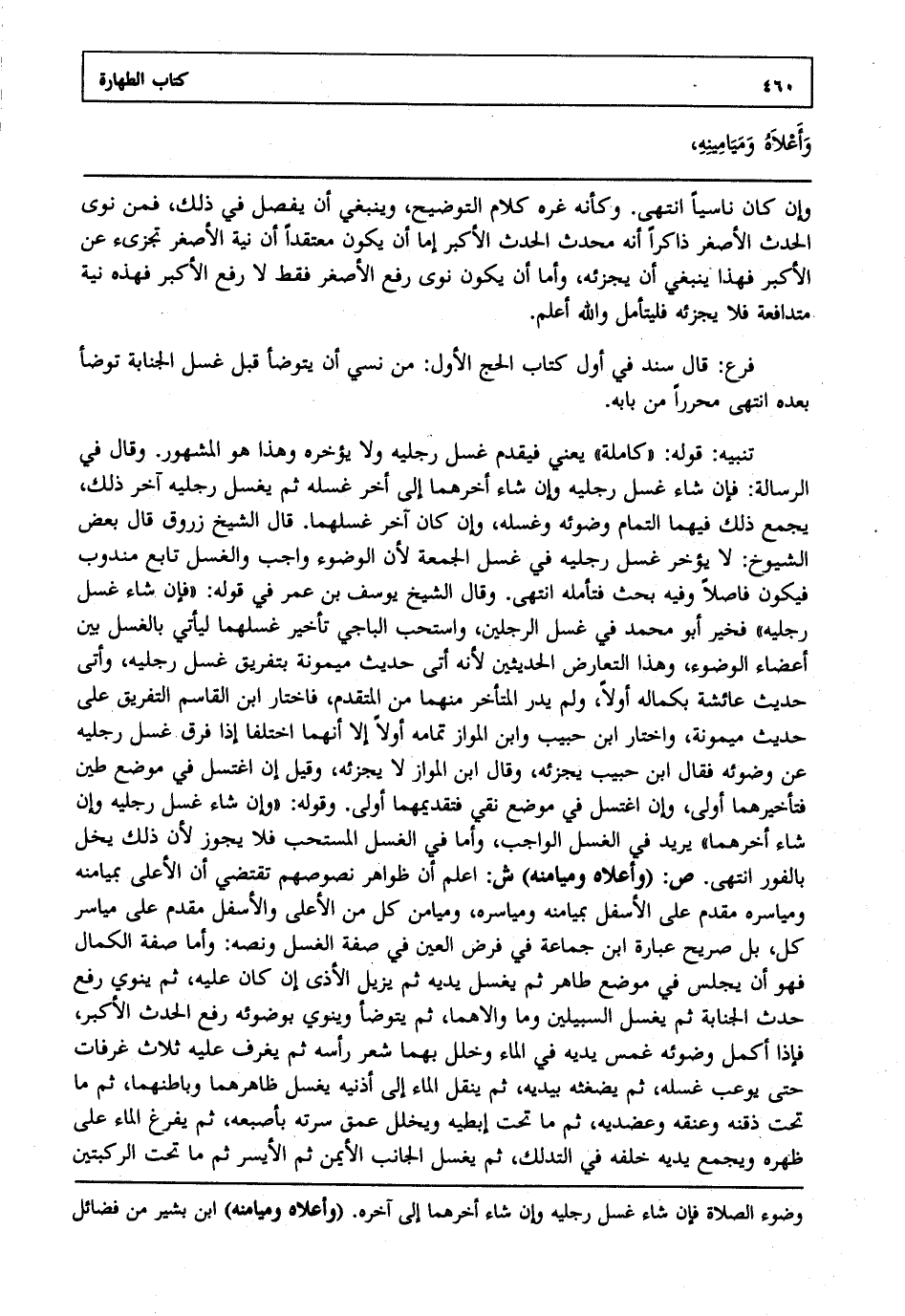 تنبيه : قوله: "كاملة" يعني فيقدم غسل رجليه ولا يؤخره وهذا هو المشهور وقال في الرسالة: فإن شاء غسل رجليه وإن شاء أخرهما إلى أخر غسله ثم يغسل رجليه آخر ذلك يجمع ذلك فيهما التمام وضوئه وغسله وإن كان آخر غسلهما قال الشيخ زروق: قال بعض الشيوخ: لا يؤخر غسل رجليه في غسل الجمعة لأن الوضوء واجب والغسل تابع مندوب فيكون فاصلا وفيه بحث فتأمله انتهى. وقال الشيخ يوسف بن عمر في قوله فإن شاء غسل رجليه فخير أبو محمد في غسل الرجلين واستحب الباجي تأخير غسلهما ليأتي كمال بين أعضاء الوضوء وهذا التعارض الحديثين لأنه أتى حديث ميمونة بتفريق غسل رجليه وأتى حديث عائشة بكماله أولا ولم يدر المتأخر منهما من المتقدم فاختار ابن القاسم التفريق على حديث ميمونة واختار ابن حبيب وابن المواز تمامه أولا إلا أنهما اختلفا إذا فرق غسل رجليه عن وضوئه فقال ابن حبيب: يجزئه وقال ابن المواز لا يجزئه وقيل إن اغتسل في موضع طين فتأخيرهما أولى وإن اغتسل في موضع نقي فتقديمهما أولى وقوله وإن شاء غسل رجليه وإن شاء أخرهما يريد في الغسل الواجب وأما في الغسل المستحب فلا يجوز لأن ذلك يخل بالفور انتهى. ص: "وأعلاه وميامنه" ش: اعلم أن ظواهر نصوصهم تقتضي أن الأعلى بميامنه ومياسره مقدم على الأسفل بميامنه ومياسره وميامن كل من الأعلى والأسفل مقدم على مياسر كل بل صريح عبارة ابن جماعة في فرض العين في صفة الغسل ونصه وأما صفة الكمال فهو أن يجلس في موضع طاهر ثم يغسل يديه ثم يزيل الأذى إن كان عليه ثم ينوي رفع حدث الجنابة ثم يغسل السبيلين وما والاهما ثم يتوضأ وينوي بوضوئه رفع الحدث الأكبر فإذا أكمل وضوئه غمس يديه في الماء وخلل بهما شعر رأسه ثم يغرف عليه ثلاث غرفات حتى يوعب غسله ثم يضغثه بيديه ثم ينقل الماء إلى أذنيه يغسل ظاهرهما وباطنهما ثم ما تحت ذقنه وعنقه وعضديه ثم ما تحت إبطيه ويخلل عمق سرته بأصبعه ثم يخلو الماء على ظهره ويجمع يديه خلفه في التدلك ثم يغسل الجانب الأيمن ثم الأيسر ثم ما تحت الركبتين