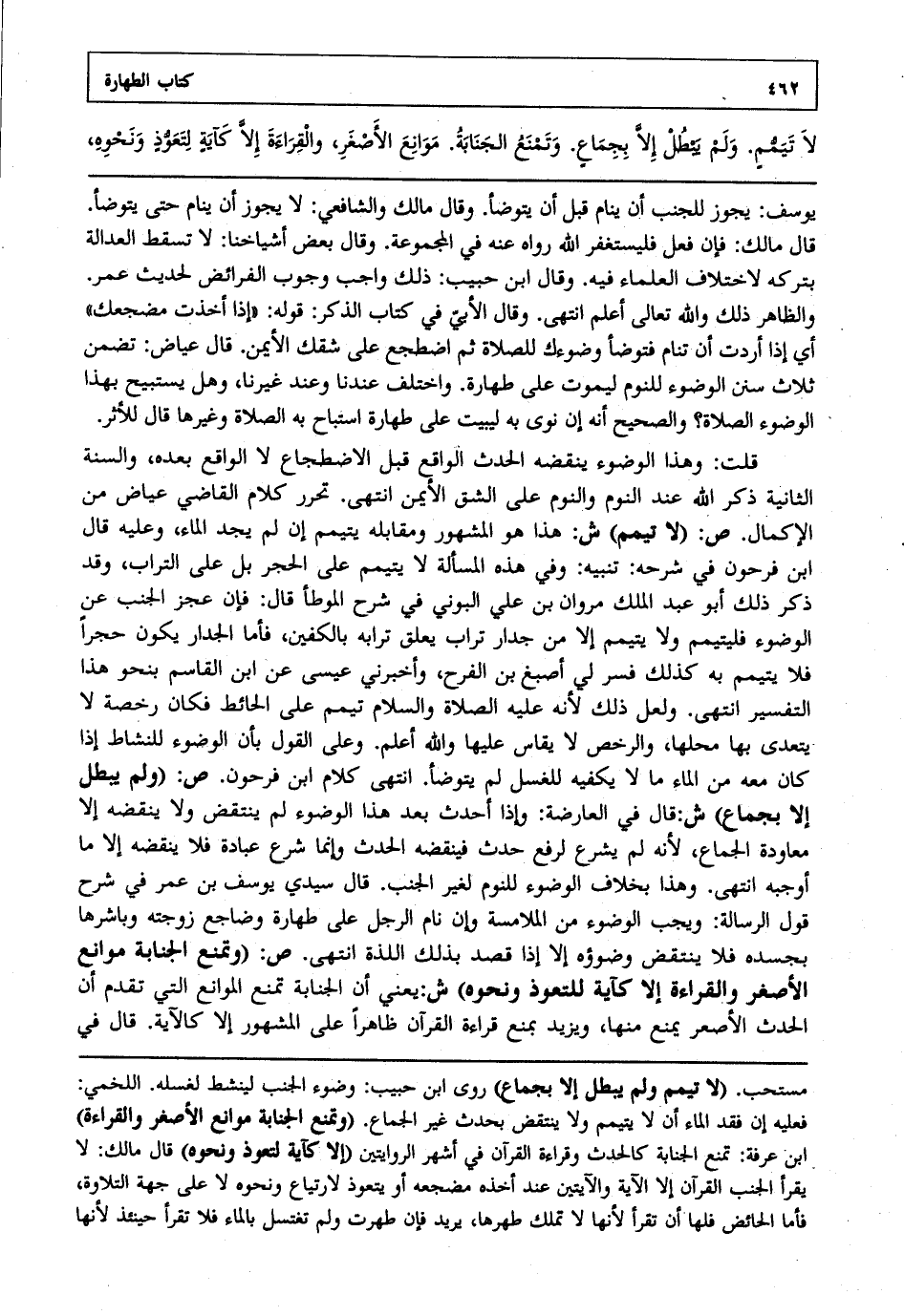 قلت: وهذا الوضوء ينقضه والحدث الواقع قبل الاضطجاع لا الواقع بعده والسنة الثانية ذكر الله عند النوم والنوم على الشق الأيمن انتهى. تحرر كلام القاضي عياض من الإكمال ص: "لا تيمم" ش: هذا هو المشهور ومقابله يتيمم إن لم يجد الماء وعليه قال ابن فرحون في شرحه: تنبيه: وفي هذه المسألة لا يتيمم على الحجر بل على التراب وقد ذكر ذلك أبو عبد الملك مروان بن علي البوني في شرح الموطأ قال فإن عجز الجنب عن الوضوء فليتيمم ولا يتيمم إلا من جدار تراب يعلق ترابه بالكفين فأما الجدار يكون حجرا فلا يتيمم به كذلك فسر لي أصبغ بن الفرح وأخبرني عيسى عن ابن القاسم بنحو هذا التفسير انتهى. ولعل ذلك لأنه عليه الصلاة والسلام تيمم على الحائط فكان رخصة لا يتعدى بها محلها والرخص لا يقاس عليها والله أعلم. وعلى القول بأن الوضوء للنشاط إذا كان معه من الماء ما لا يكفيه للغسل لم يتوضأ انتهى. كلام ابن فرحون ص: "ولم يبطل إلا بجماع" ش: قال في العارضة وإذا أحدث بعد هذا الوضوء لم ينتقض ولا ينقضه إلا معاودة الجماع لأنه لم يشرع لرفع حدث فينقضه الحدث وإنما شرع عبادة فلا ينقضه إلا ما أوجبه انتهى. وهذا بخلاف الوضوء للنوم لغير الجنب قال سيدي يوسف بن عمر في شرح قول الرسالة ويجب الوضوء من الملامسة وإن نام الرجل على طهارة وضاجع زوجته وباشرها بجسده فلا ينتقض وضوؤه إلا إذا قصد بذلك اللذة انتهى. ص: "وتمنع الجنابة موانع الأصغر والقراءة إلا كآية للتعوذ ونحوه" ش: يعني أن الجنابة تمنع الموانع التي تقدم أن الحدث الأصغر يمنع منها ويزيد بمنع قراءة القرآن ظاهرا على المشهور إلا كالآية قال في