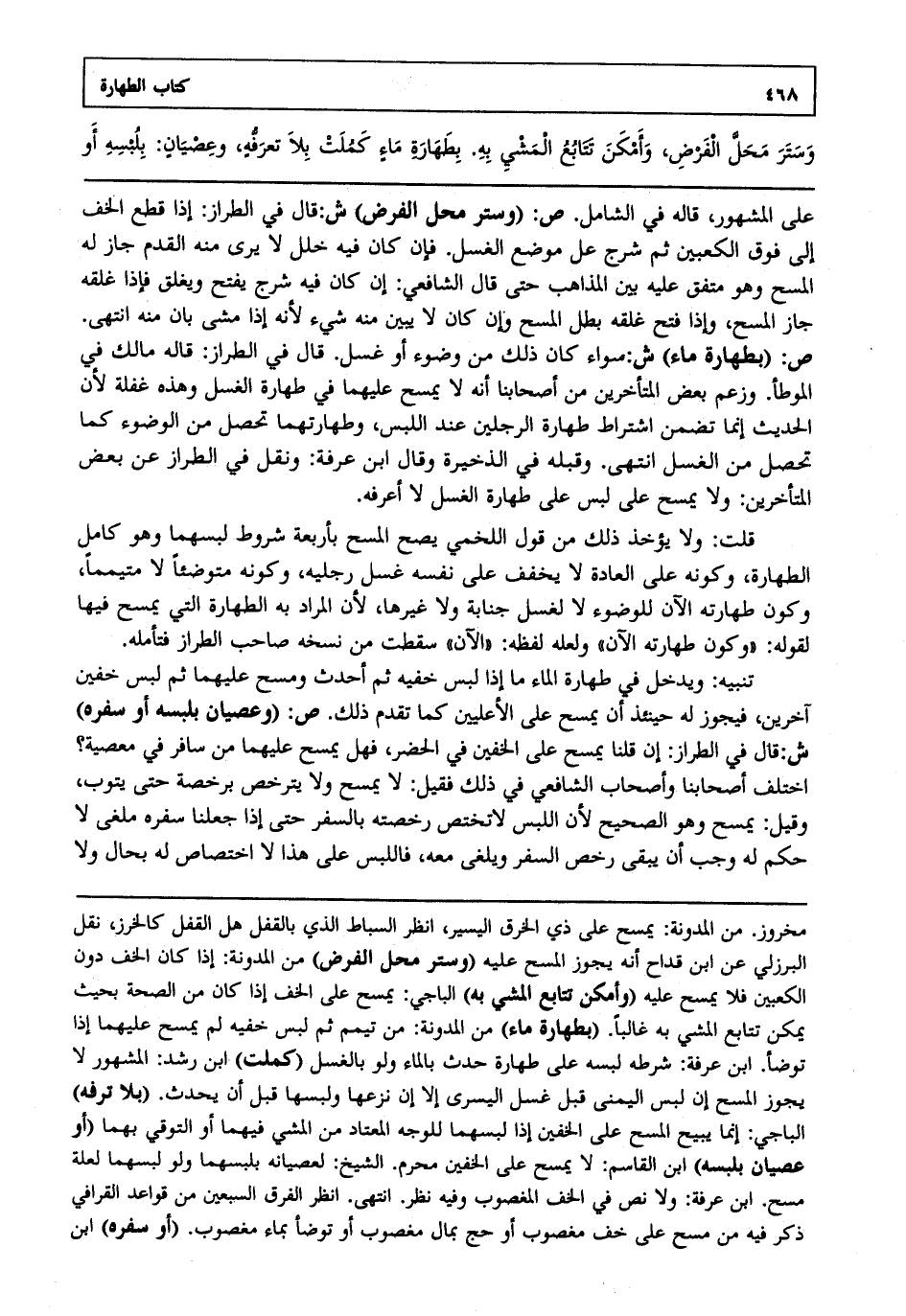 على المشهور، قاله في الشامل ص: "وستر محل الفرض" ش: قال في الطراز: إذا قطع الخف إلى فوق الكعبين ثم شرج على موضع الغسل فإن كان فيه خلل لا يرى منه القدم جاز له المسح وهو متفق عليه بين المذاهب حتى قال الشافعي: إن كان فيه شرج يفتح ويغلق فإذا غلقه جاز المسح وإذا فتح غلقه بطل المسح وإن كان لا يبين منه شيء لأنه إذا مشى بان منه انتهى. ص: "بطهارة ماء" ش: سواء كان ذلك من وضوء أو غسل قال في الطراز: قاله مالك في الموطأ وزعم بعض المتأخرين من أصحابنا أنه لا يمسح عليهما في طهارة الغسل وهذه غفلة لأن الحديث إنما تضمن اشتراط طهارة الرجلين عند اللبس وطهارتهما تحصل من الوضوء كما تحصل من الغسل انتهى. وقبله في الذخيرة وقال ابن عرفة: ونقل في الطراز عن بعض المتأخرين ولا يمسح على لبس على طهارة الغسل لا أعرفه.