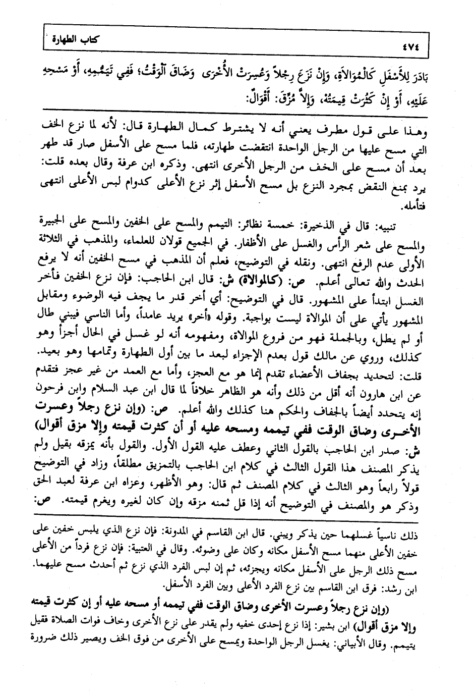 وهذا على قول مطرف يعني أنه لا يشترط كمال الطهارة قال لأنه لما نزع الخف التي مسح عليها من الرجل الواحدة انتقضت طهارته فلما مسح على الأسفل صار قد طهر بعد أن مسح على الخف من الرجل الأخرى انتهى. وذكره ابن عرفة وقال بعده قلت: يرد بمنع النقض بمجرد النزع بل مسح الأسفل إثر نزع الأعلى كدوام لبس الأعلى انتهى. فتأمله.