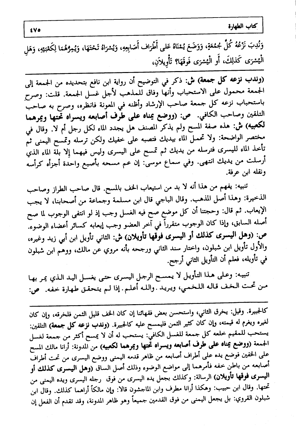وندب نزعه كل جمعة ووضع يمناه على أطراف أصابعه، ويسراه تحتها ويمرهما لكعبيه، وهل اليسرى كذلك، أو اليسرى فوقها؟ تأويلان