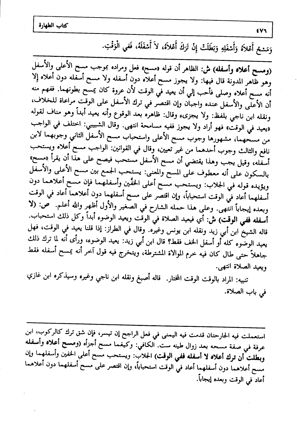 ومسح أعلاه وأسفله وبطلت إن ترك أعلاه، لا أسفله ففي الوقت.