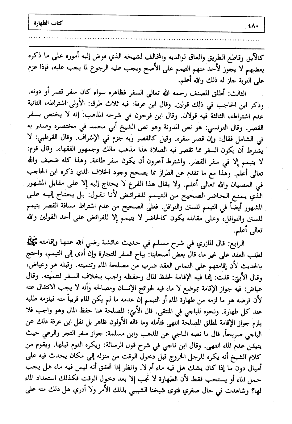 الرابع : قال المازري في شرح مسلم في حديث عائشة رضي الله عنها وإقامته صلى الله عليه وسلم لطلب العقد على غيرماء قال بعض أصحابنا يباح السفر للتجارة وإن أدى إلى التيمم واحتج بالحديث لأن إقامتهم على التماس العقد ضرب من مصلحة الماء وتنميته وقبله هو وعياض وقال الأبي قلت: إنما فيه الإقامة لحفظ المال وحفظه واجب بخلاف السفر لتنميته وقال عياض فيه جواز الإقامة بموضع لا ماء فيه لحوائج الإنسان ومصالحه وأنه لا يجب الانتقال عنه لأن فرضه هو ما لزمه من طهارة الماء أو التيمم إن عدمه ما لم يكن الماء قريبا منه فيلزمه طلبه عند كل طهارة ونحوه للباجي في المنتقى قال الأبي المصلحة هنا حفظ المال وهو واجب فلا يلزم جواز الإقامة لمطلق المصلحة انتهى. فتأمله وما قاله الأولون ظاهر بل نقل ابن عرفة ذلك عن الباجي صريحا قال ما نصه الباجي عن المذهب وابن مسلمة جواز سفر التجر والرعي حيث يتيقن عدم الماء انتهى. وقال ابن ناجي في شرح قول الرسالة: ويكره النوم قبلها ويقوم من كلام الشيخ أنه يكره للرجل الخروج قبل دخول الوقت من منزله إلى مكان يحدث فيه على أميال دون ما إذا كان يشك هل فيه ماء أم لا وانظر إذا تحقق أنه ليس فيه ماء هل يجب حمل الماء أو يستحب فقط لأن الطهارة لا تجب إلا بعد دخول الوقت فكذلك استعداد الماء لها وشاهدت في حال صغري فتوى شيخنا الشبيبي بذلك الأمر ولا أدري هل ذلك منه على