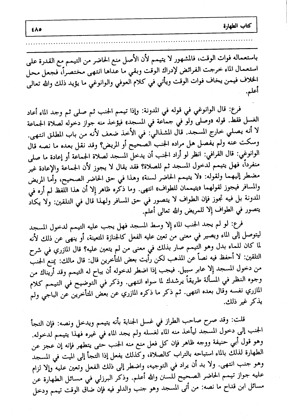 قلت: وقد صرح صاحب الطراز في غسل الجنابة بأنه يتيمم ويدخل ونصه فإن التجأ الجنب إلى دخول المسجد ليأخذ منه الماء لغسله ولم يجد الماء في غيره فهذا يتيمم لدخوله وهو قول أبي حنيفة ووجه ظاهر فإن كل فعل منع منه الجنب حتى يتطهر فإنه إن عجز عن الطهارة لذلك بالماء استباحه بالتراب كالصلاة وكذلك يفعل إذا التجأ إلى الميت في المسجد وهو جنب انتهى. ولا بد أن يراد في التوجيه واضطر إلى ذلك الفعل وتعين عليه وإلا لزام عليه جواز تيمم الحاضر الصحيح للسنن والله أعلم. وذكر البرزلي في مسائل الطهارة عن مسائل ابن قداح ما نصه من أتى المسجد وهو جنب والدلو فيه فإن ضاق الوقت تيمم ودخل