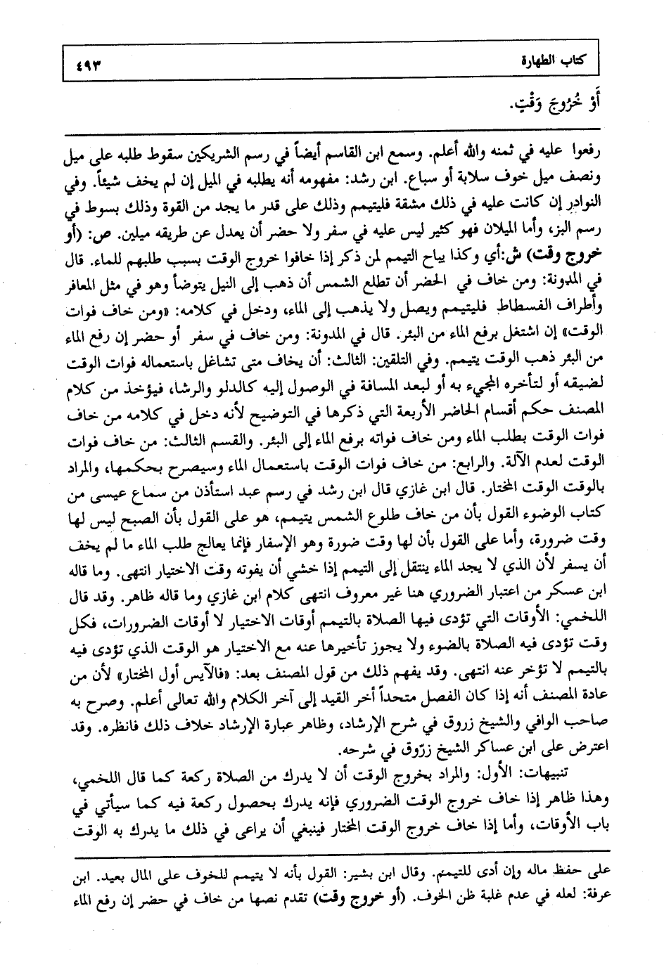 رفعوا عليه في ثمنه والله أعلم. وسمع ابن القاسم أيضا في رسم الشريكين سقوط طلبه على ميل ونصف ميل خوف سلابة أو سباع ابن رشد مفهومه أنه يطلبه في الميل إن لم يخف شيئا وفي النوادر إن كانت عليه في ذلك مشقة فليتيمم وذلك على قدر ما يجد من القوة وذلك بسوط في رسم البز وأما الميلان فهو كثير ليس عليه في سفر ولا حضر أن يعدل عن طريقه ميلين ص: "أو خروج وقت" ش: أي وكذا يباح التيمم لمن ذكر إذا خافوا خروج الوقت بسبب طلبهم للماء قال في المدونة: ومن خاف في الحضر أن تطلع الشمس أن ذهب إلى النيل يتوضأ وهو في مثل المعافر وأطراف الفسطاط فليتيمم ويصل ولا يذهب إلى الماء ودخل في كلامه ومن خاف فوات الوقت إن اشتغل برفع الماء من البئر قال في المدونة: ومن خاف في سفر أو حضر إن رقع الماء من البئر ذهب الوقت يتيمم وفي التلقين الثالث أن يخاف متى تشاغل باستعماله فوات الوقت لضيقه أو لتأخره المجيء به أو لبعد المسافة في الوصول إليه كالدلو والرشا فيؤخذ من كلام المصنف حكم أقسام الحاضر الأربعة التي ذكرها في التوضيح لأنه دخل في كلامه من خاف فوات الوقت بطلب الماء ومن خاف فواته برفع الماء إلى البئر والقسم الثالث من خاف فوات الوقت لعدم الآلة والرابع من خاف فوات الوقت باستعمال الماء وسيصرح بحكمها والمراد بالوقت الوقت المختار قال ابن غازي قال ابن رشد في رسم عبد استأذن من سماع عيسى من كتاب الوضوء: القول بأن من خاف طلوع الشمس يتيمم هو على القول بأن الصبح ليس لها وقت ضرورة وأما على القول بأن لها وقت ضرورة وهو الإسفار فإنما يعالج طلب الماء ما لم يخف أن يسفر لأن الذي لا يجد الماء ينتقل إلى التيمم إذا خشي أن يفوته وقت الاختيار انتهى. وما قاله ابن عسكر من اعتبار الضروري هنا غير معروف انتهى. كلام ابن غازي وما قاله ظاهر وقد قال اللخمي: الأوقات التي تؤدى فيها الصلاة بالتيمم أوقات الاختيار لا أوقات الضرورات فكل وقت تؤدى فيه الصلاة بالضرورة ولا يجوز تأخيرها عنه مع الاختيار هو الوقت الذي تؤدى فيه بالتيمم لا تؤخر عنه انتهى. وقد يفهم ذلك من قول المصنف بعد: "فالآيس أول المختار" لأن من عادة المصنف أنه إذا كان الفصل متحدا أخر القيد إلى آخر الكلام والله تعالى أعلم. وصرح به صاحب الواقي والشيخ زروق في شرح الإرشاد وظاهر عبارة الإرشاد خلاف ذلك فانظره وقد اعترض على ابن عساكر الشيخ زروق في شرحه.